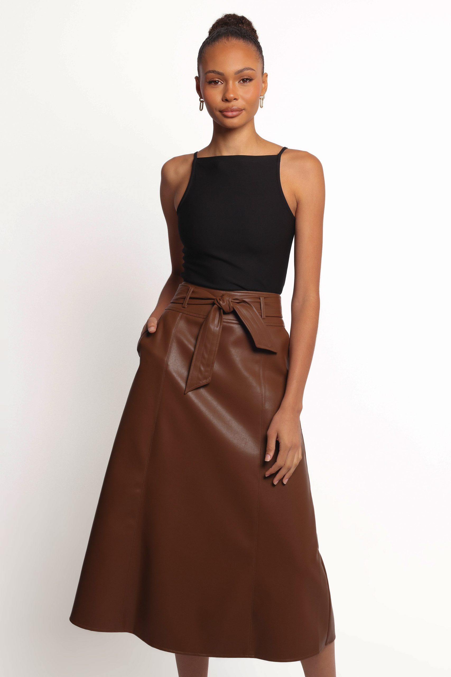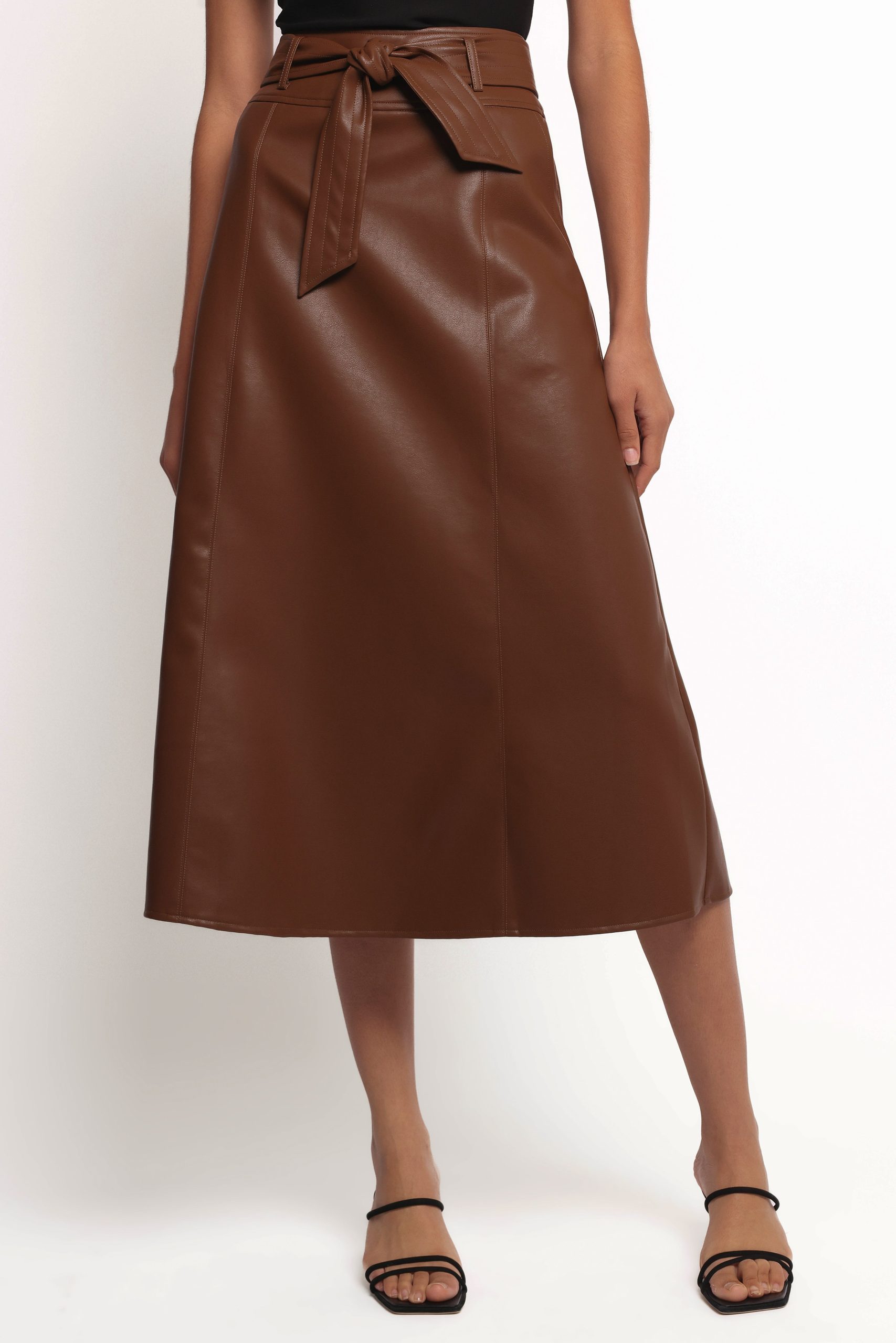 Elevate your wardrobe with the Adaline Faux Leather Midi Skirt in rich brown. a statement piece that combines chic design with everyday functionality. Its high-waisted. A-line silhouette flatters your figure. while the midi length adds a touch of timeless elegance