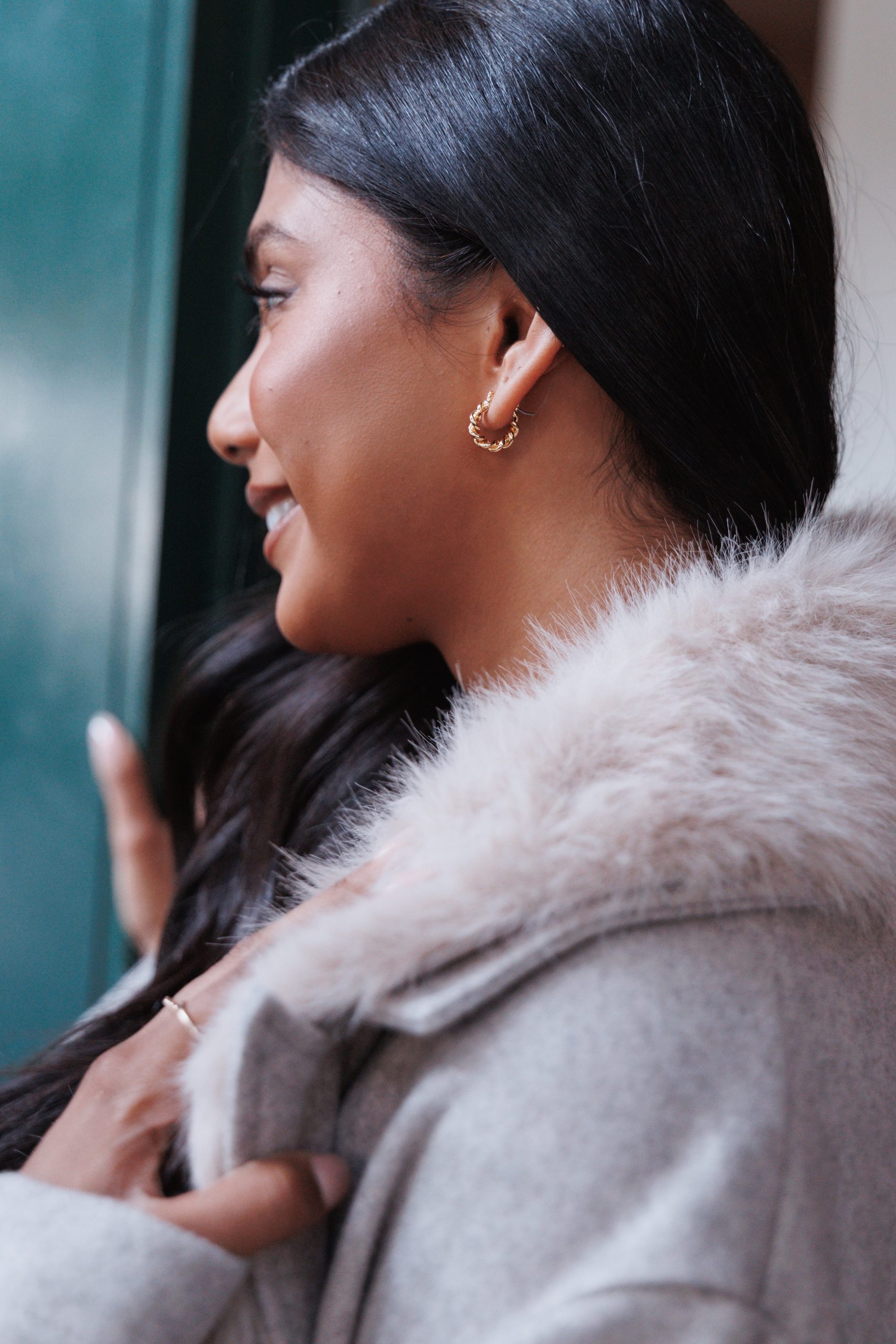 Make a bold statement with the Amity Earrings in Gold. where contemporary design meets timeless elegance. These hoop-style earrings feature a striking two-tone twist that adds depth and dimension. making them the perfect accessory to elevate any outfit.
