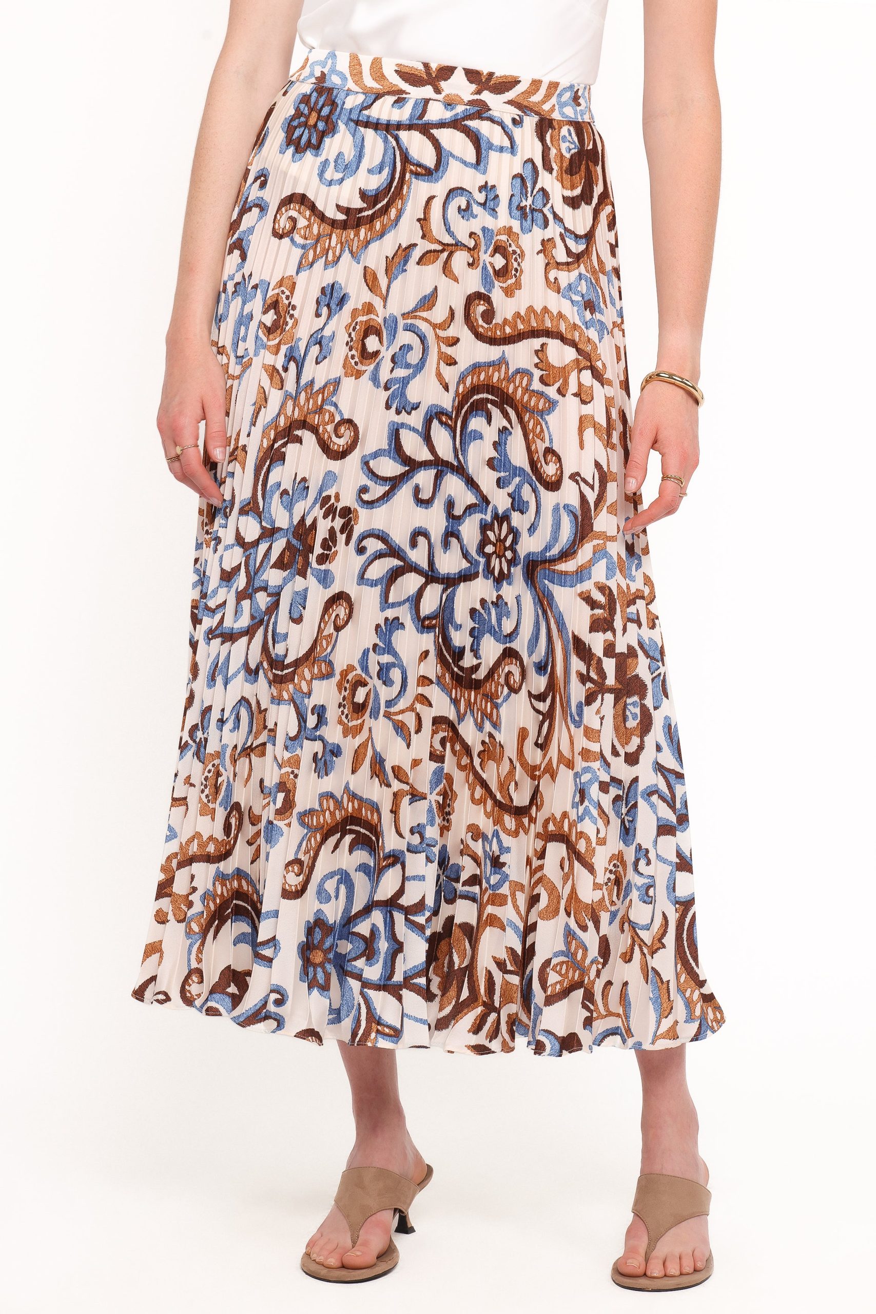 Step into effortless elegance with the Aoife Pleated Midi Skirt in stunning ivory. brown. and blue florals. This high-waisted beauty creates the most flattering silhouette while the back elasticised waistband ensures all-day comfort that moves with you.