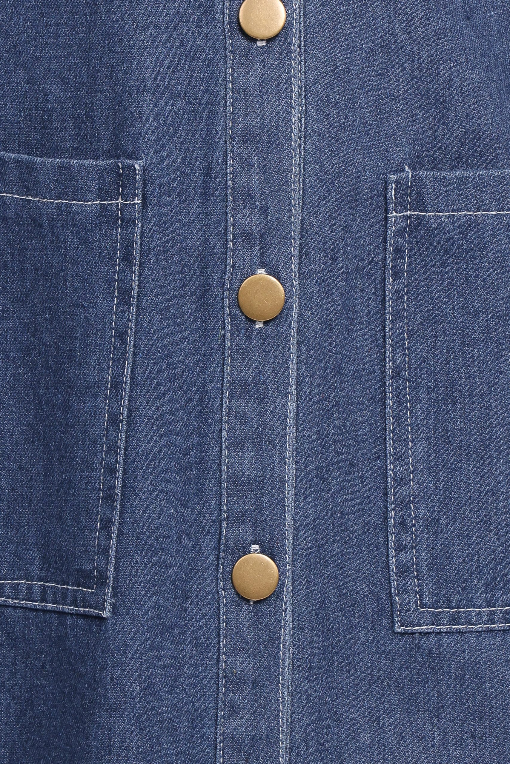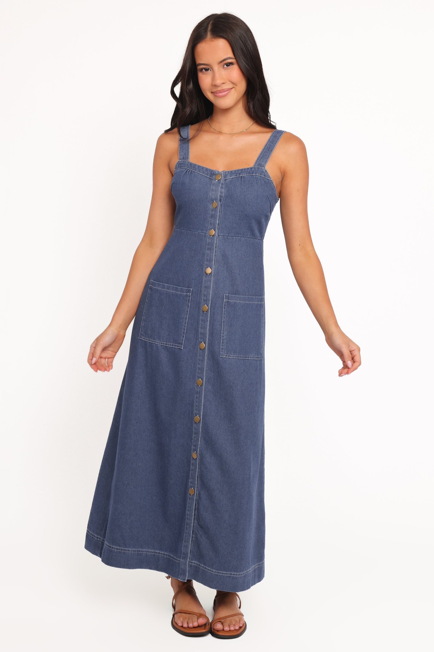This midi dress in mid blue denim is the perfect addition to your wardrobe! It’s designed with functional button down close and front pockets. Featuring a shirred back panel for extra comfort.