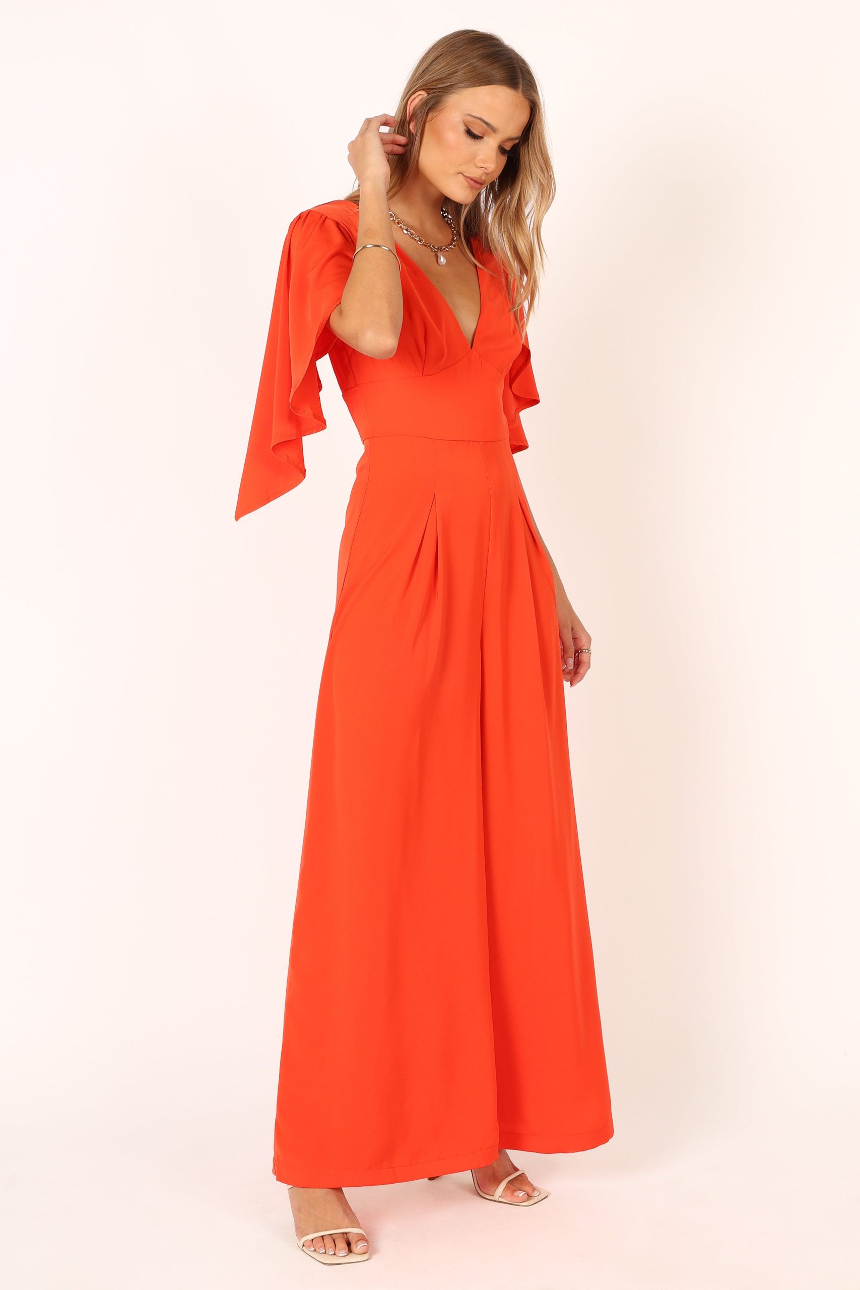 Be the talk of the party in this stunning red jumpsuit! This full length jumpsuit features a V neckline. mid-length cape sleeves. and an invisible back zip with hook and eye clasp. Its wide leg pant creates a relaxed yet sophisticated look – perfect for your special occasion.