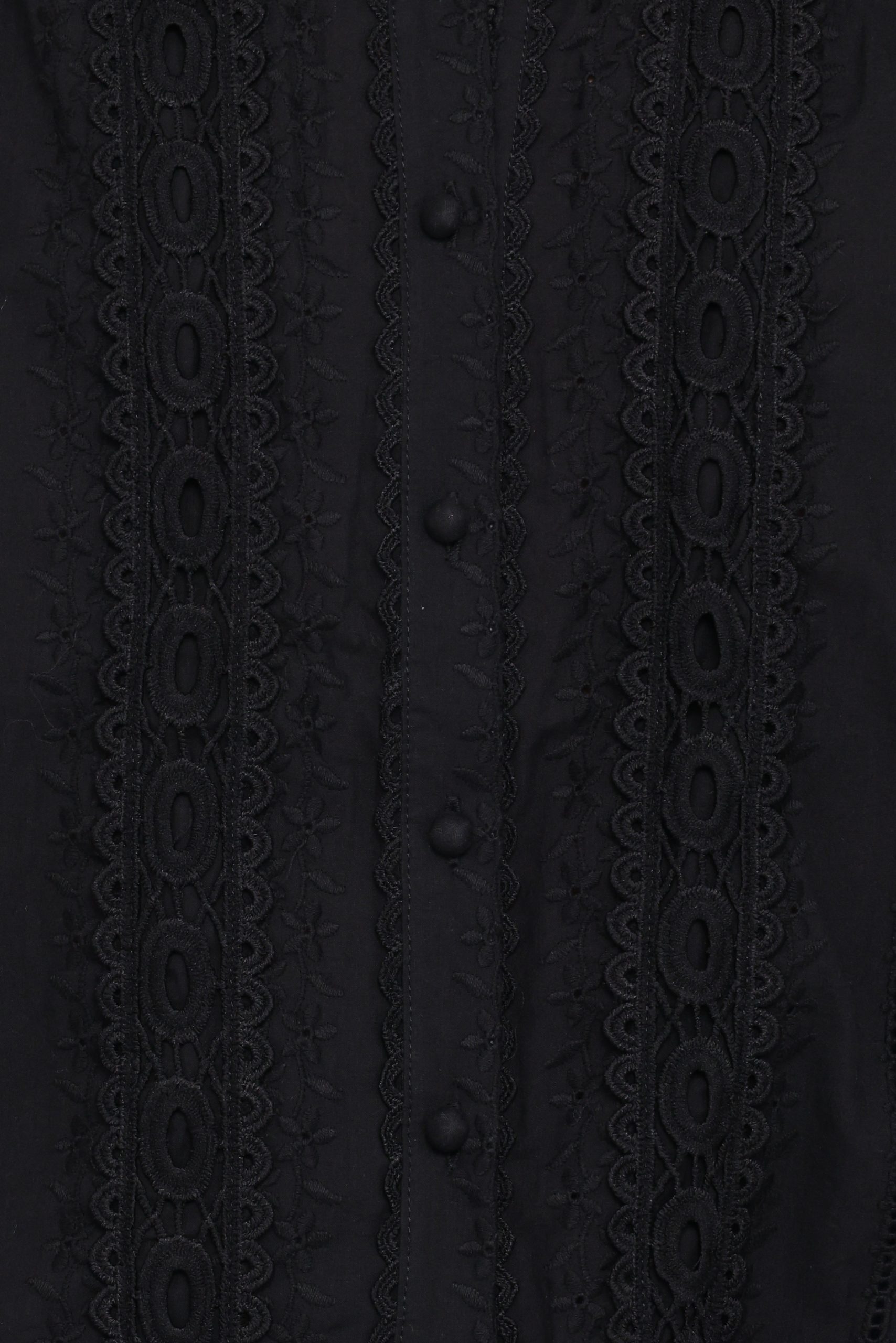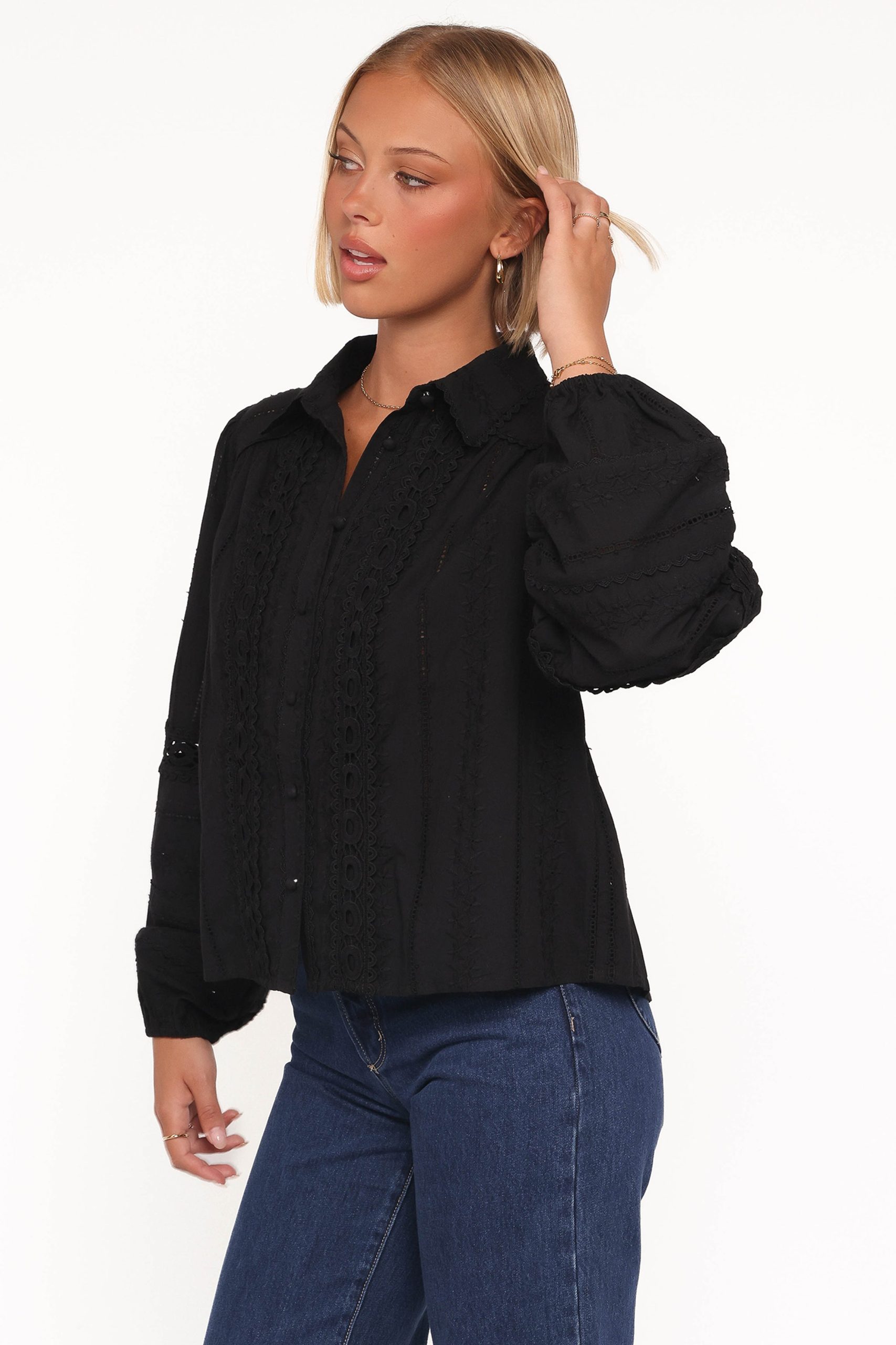 Introducing the Catania Lace Inset Top in classic black. a must-have for elevating your wardrobe. This top features a sophisticated spread collar and functional buttons down the front. offering a timeless look with a touch of modern charm.