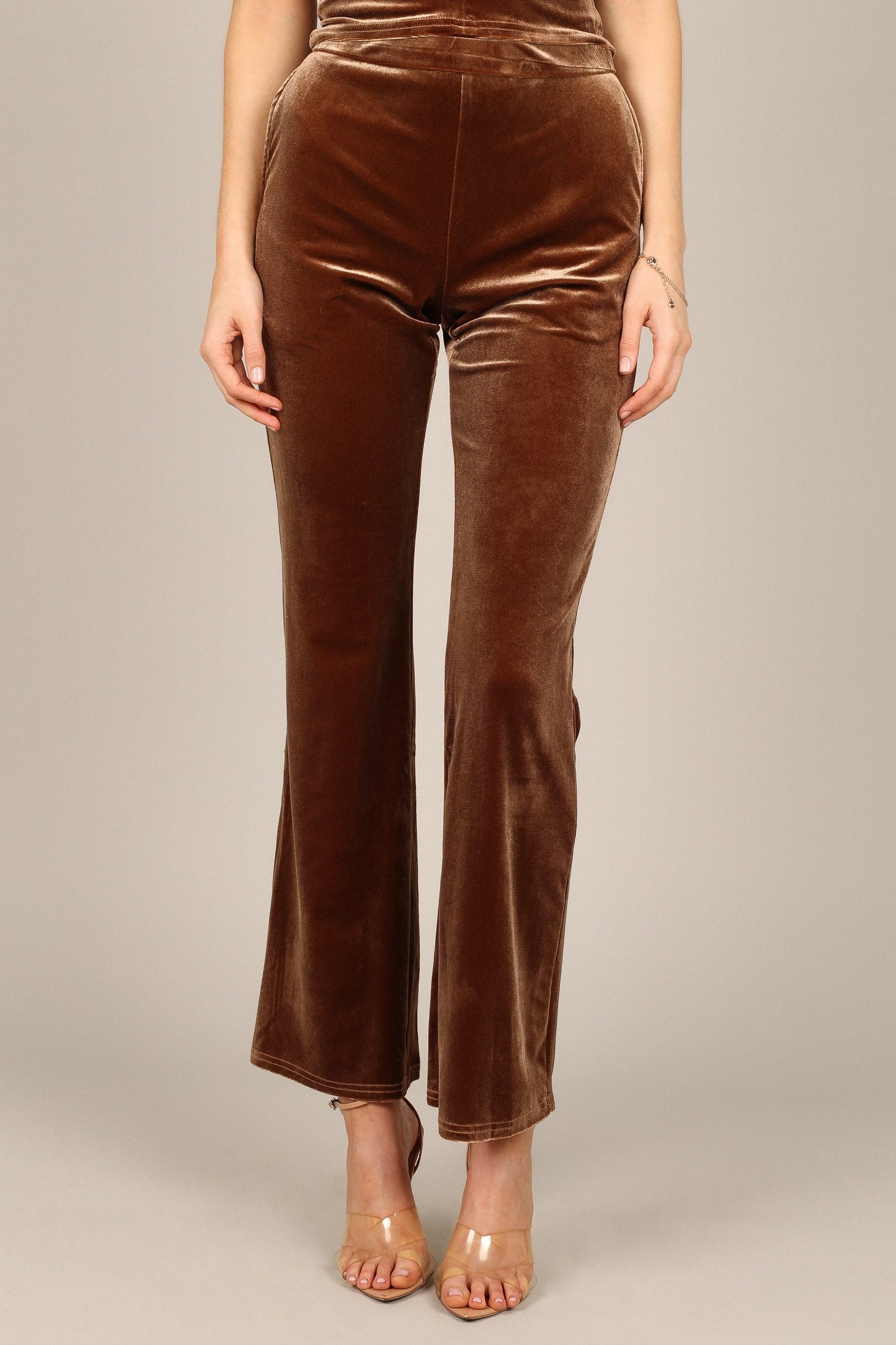 Get holiday-ready with our fun brown flared velvet pants! These high-waisted gems boast an elasticised waistband for your comfort. and functional side pockets. Add touch of festive flair to your wardrobe!