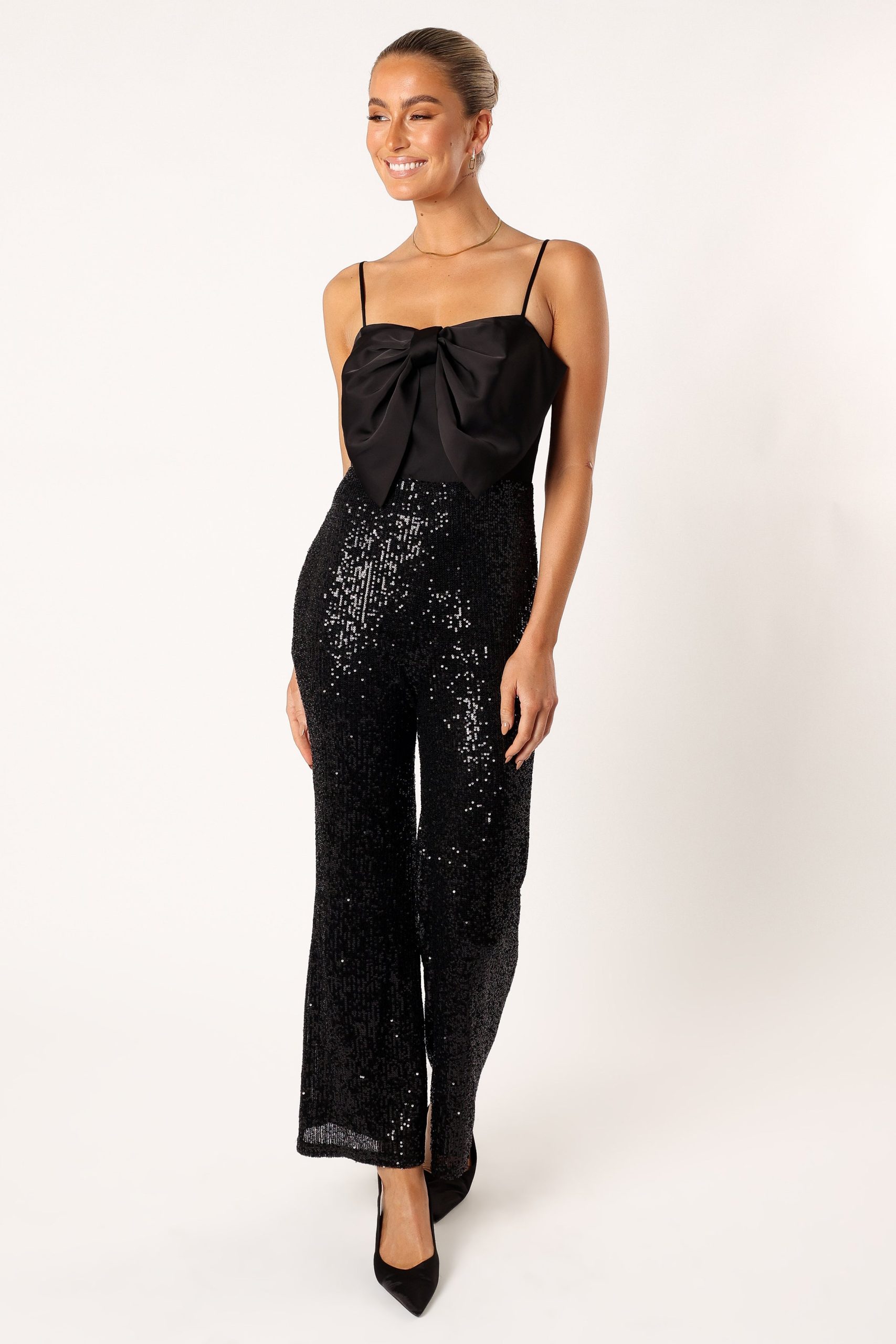 Create a look that’s equal parts eye-catching and elegant with this must-have sequin playsuit! With its above maxi length. bow design and invisible back zip. it’ll give you a classic yet on-trend silhouette.