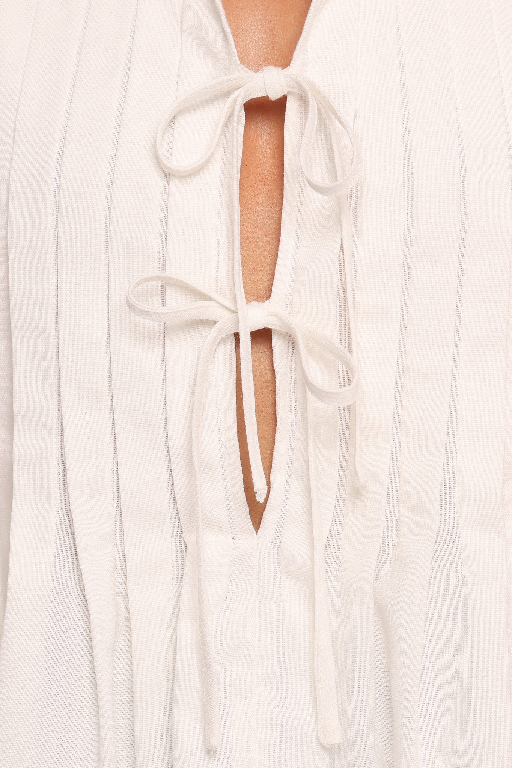 Elevate your wardrobe with the Delia Pleat Tie Top in a stunning shade of blue. This chic piece features a round neckline and a deep V-front with a charming tie closure. presenting an effortlessly stylish look that’s perfect for any occasion.