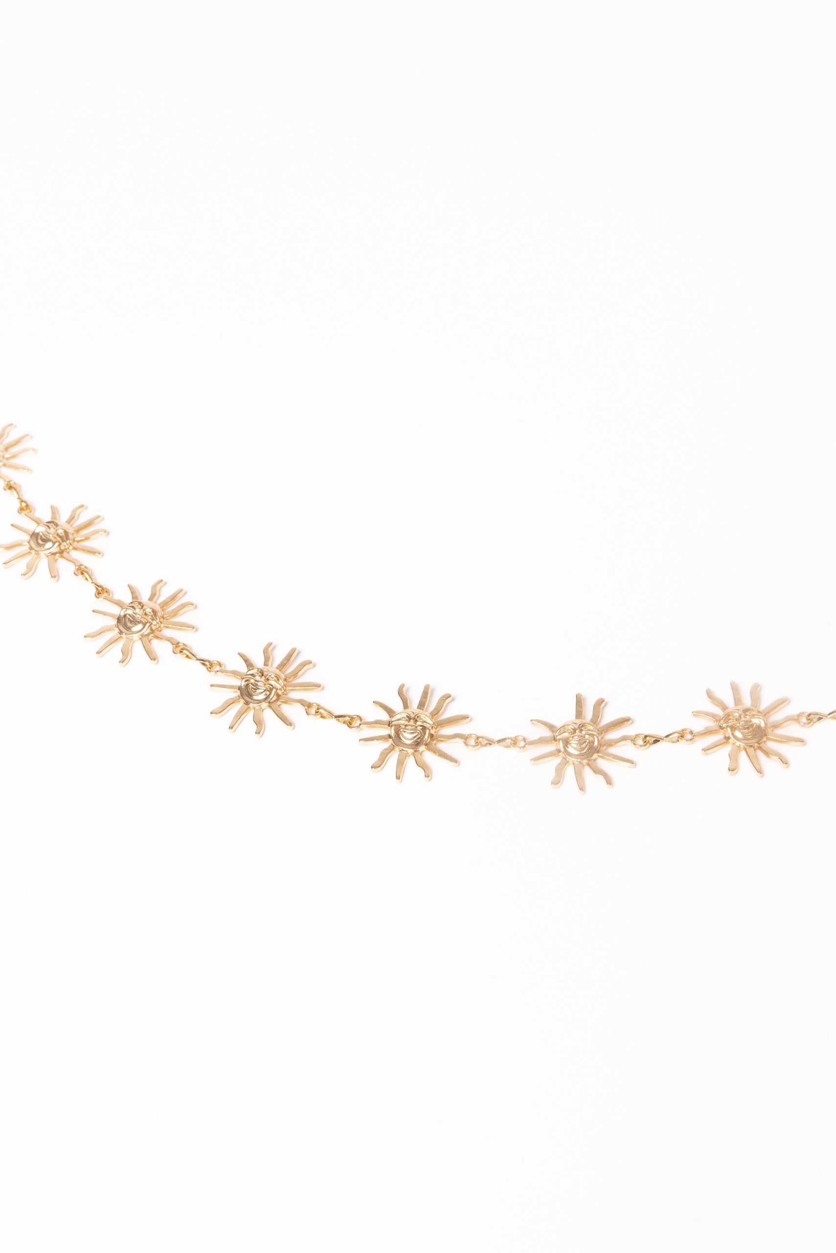 Add a touch of glamour to any outfit with the Emmeline Belt – Gold. Featuring a modern chain design and a striking sun pendant. this accessory is as bold as it is beautiful.