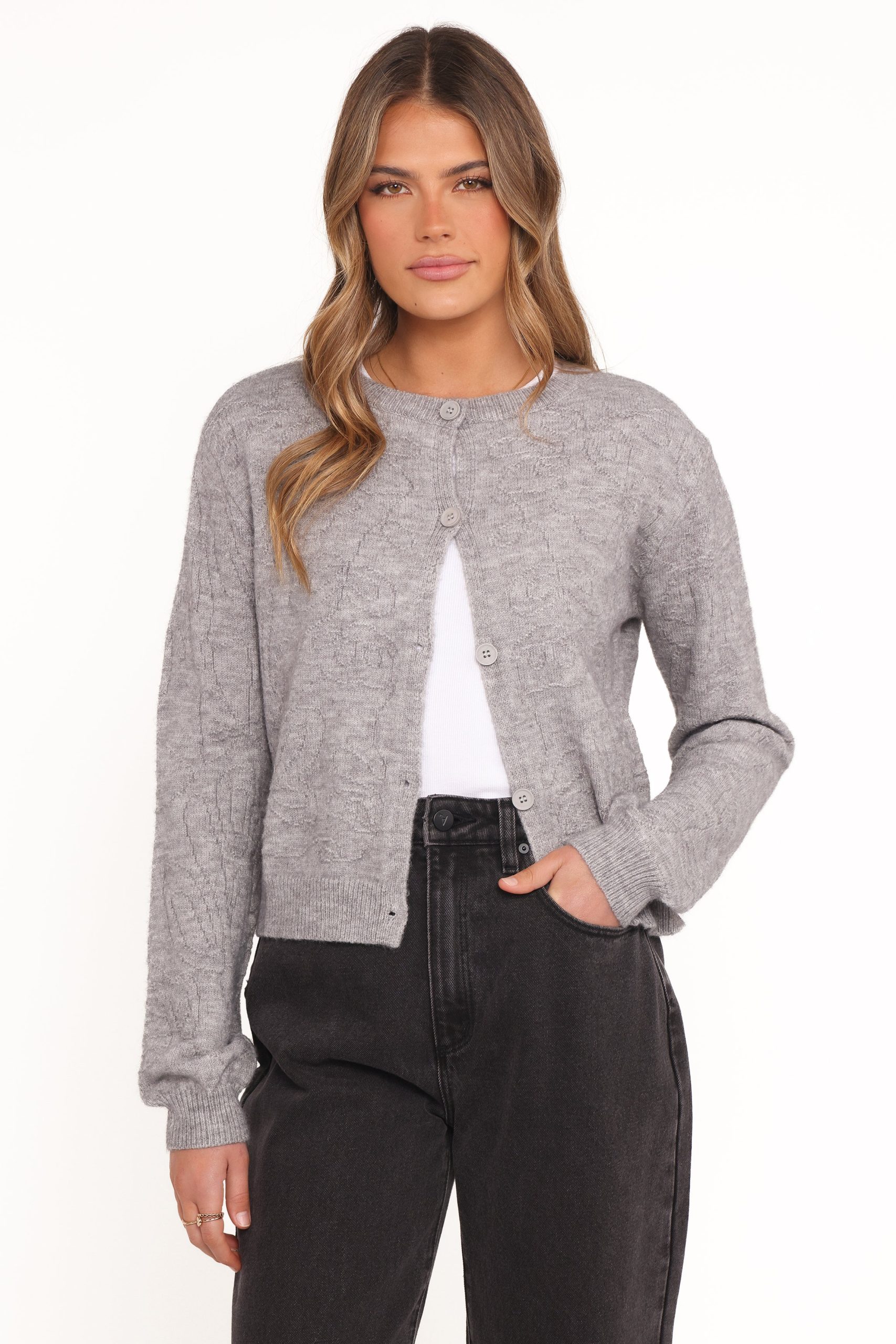 Add a touch of understated charm to your wardrobe with the Fauna Tonal Floral Cardigan in Heather Grey. This versatile piece combines classic design with a subtle floral pattern to elevate even the simplest of outfits.