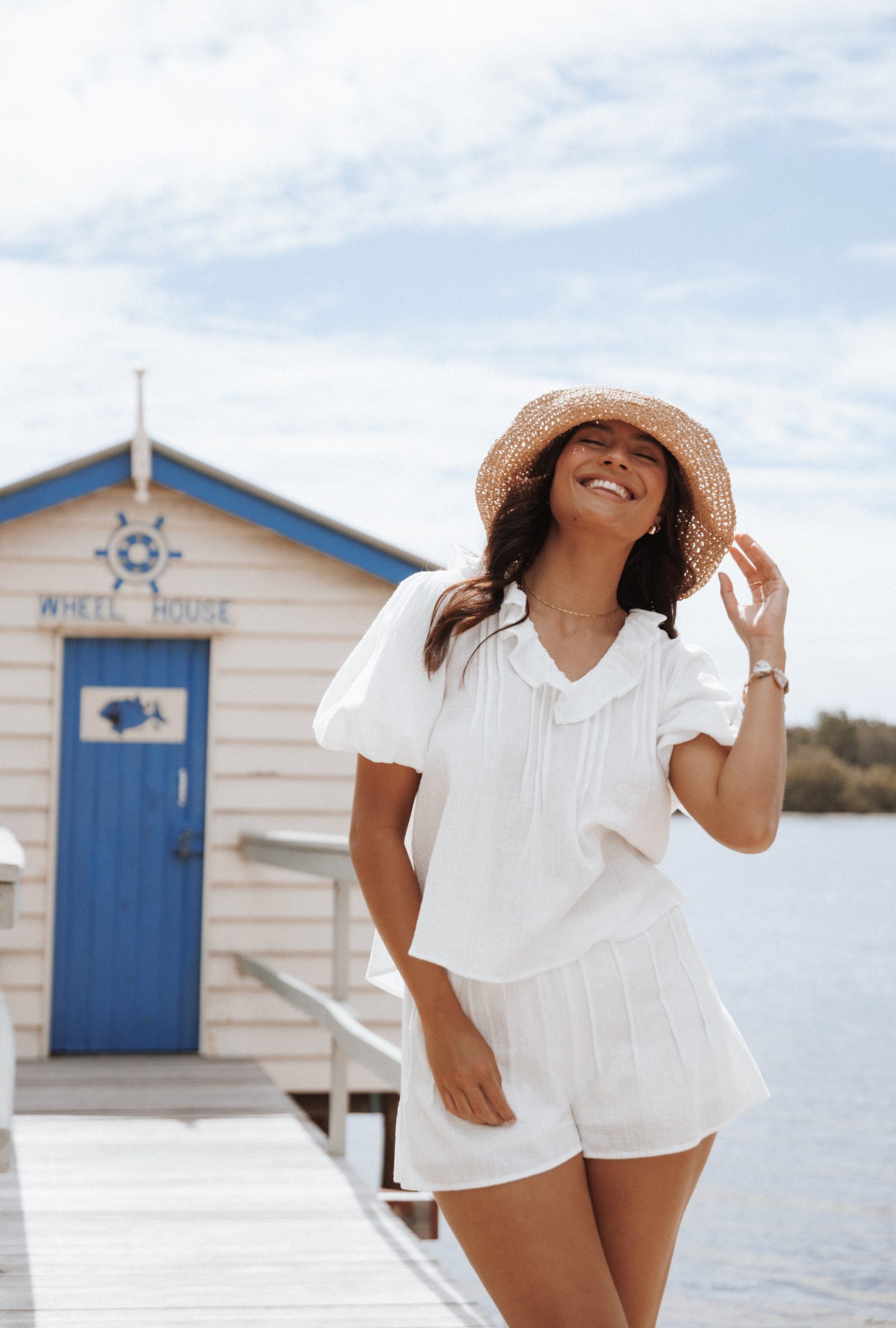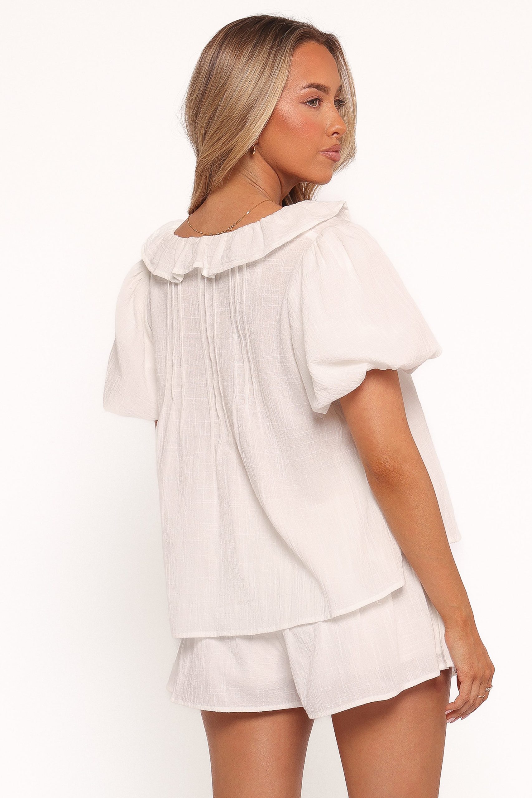 Featuring a relaxed top with a v-neckline and chic collar detail. this set is designed to keep you looking polished with minimal effort. The high-waisted shorts. complete with an elasticized shirred waistband and delicate pin tuck pleats. combine flattering form with all-day ease.