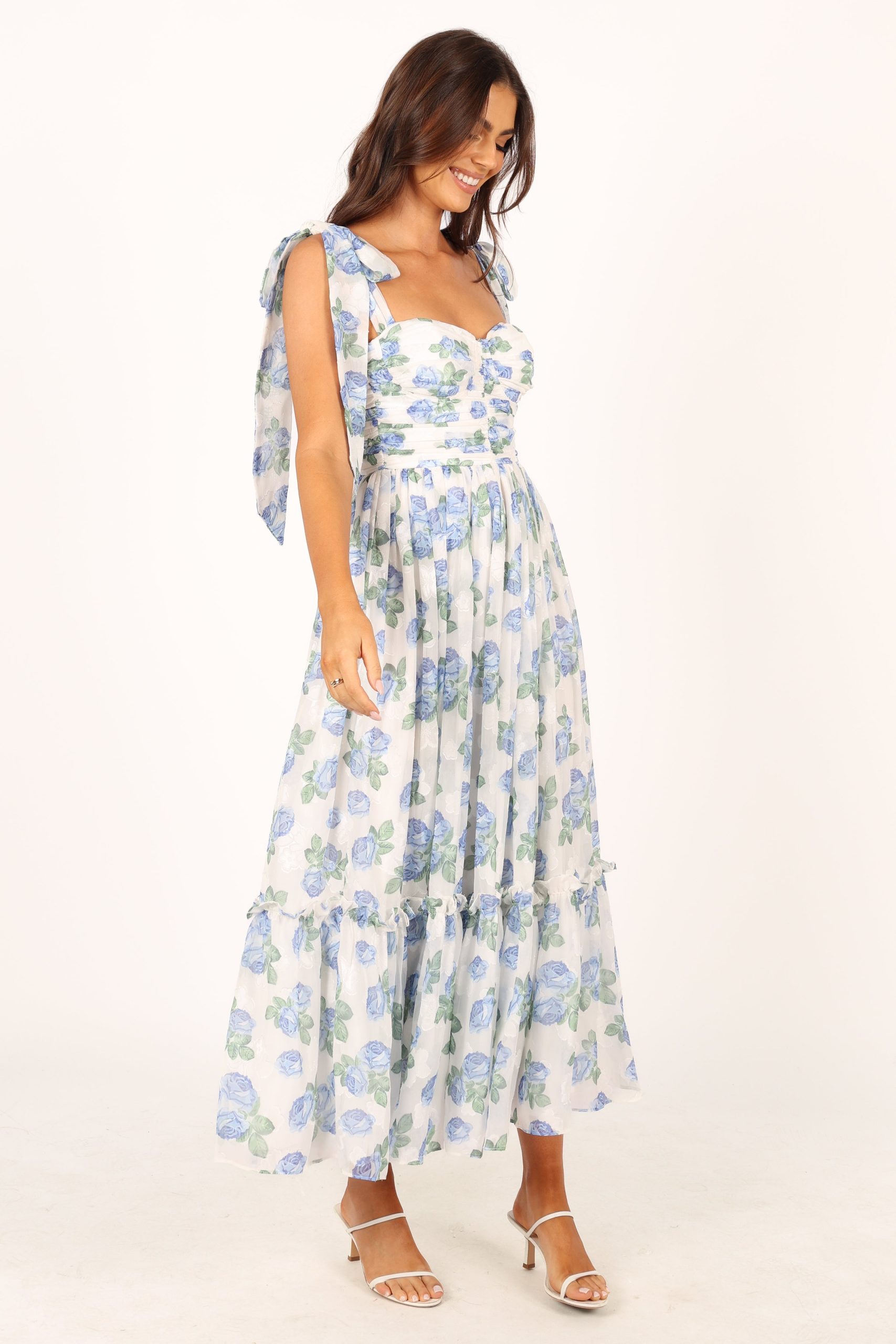 Make a statement in this dreamy dress! This midi dress features a sweetheart neckline. tie close shoulder straps. and padded cups in the bust for extra support and to top it all off. this dress is made with a blue floral chiffon overlay for an elegant touch. Perfect for any special occasion.