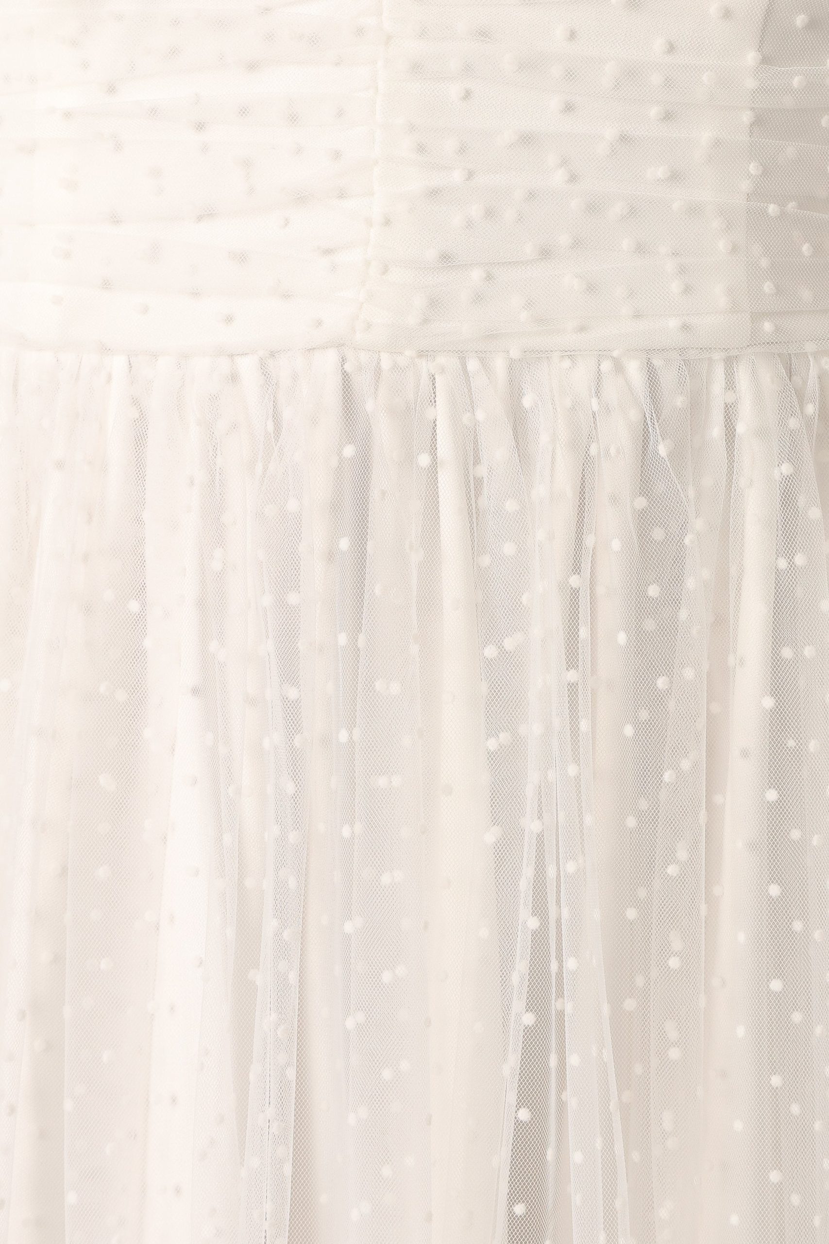 Make a statement in this dreamy dress! This midi dress features a sweetheart neckline. tie close shoulder straps. and padded cups in the bust for extra support and to top it all off. this dress is made with a white polka dot tulle overlay for an elegant touch. Perfect for any special occasion.