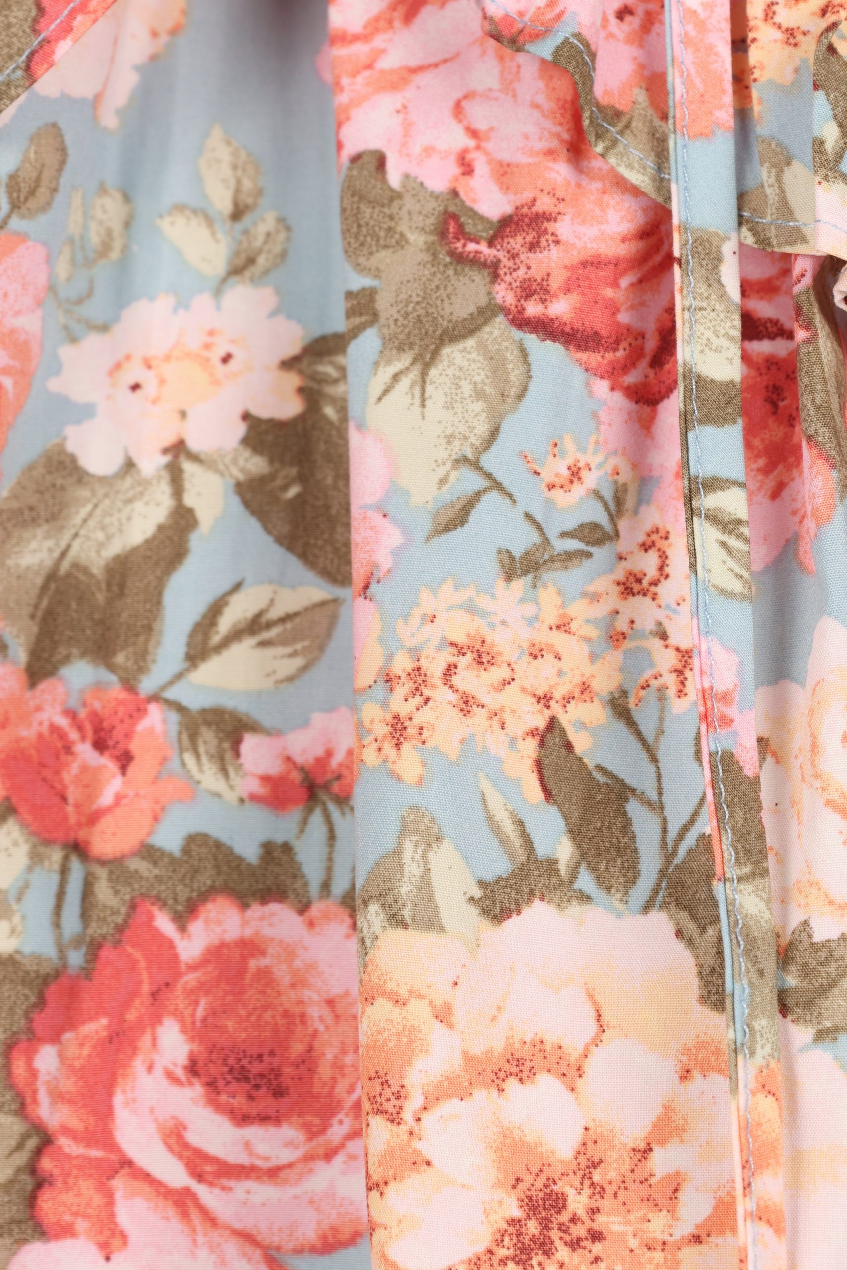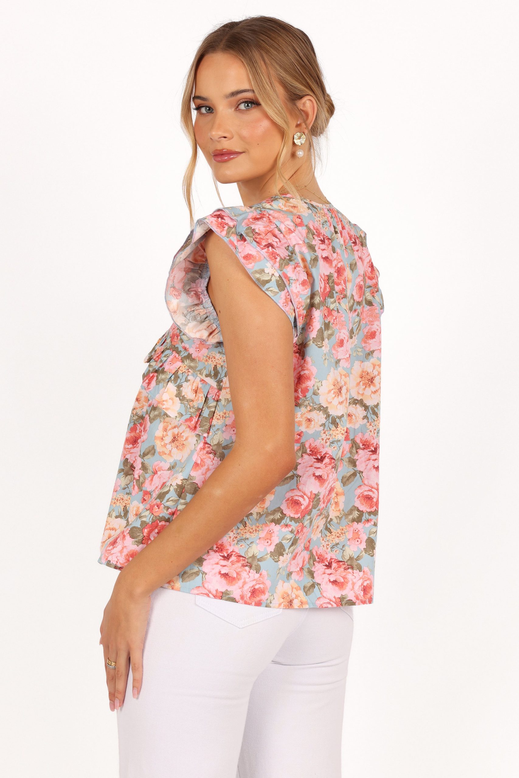 Discover timeless elegance with the Gracey Top in Vintage Blue. Crafted for those who appreciate refined . this top features a high neckline with a tie close. The short ruffle sleeves and front cut-out detail add a subtle yet charming flair.