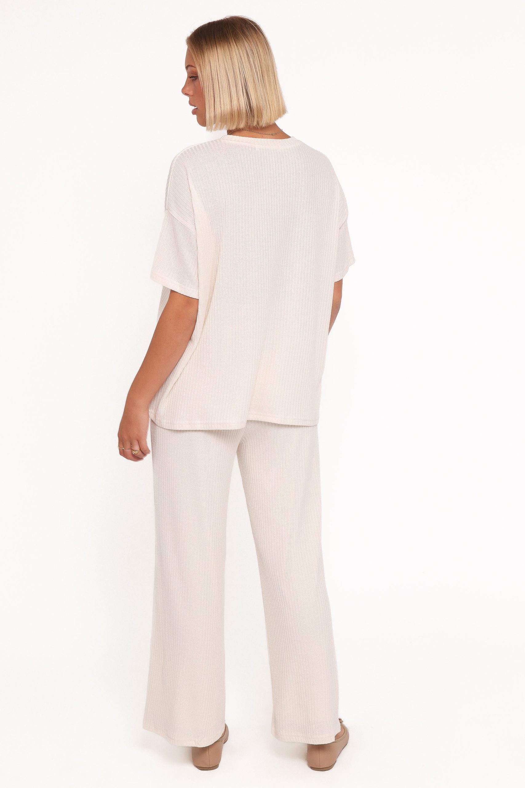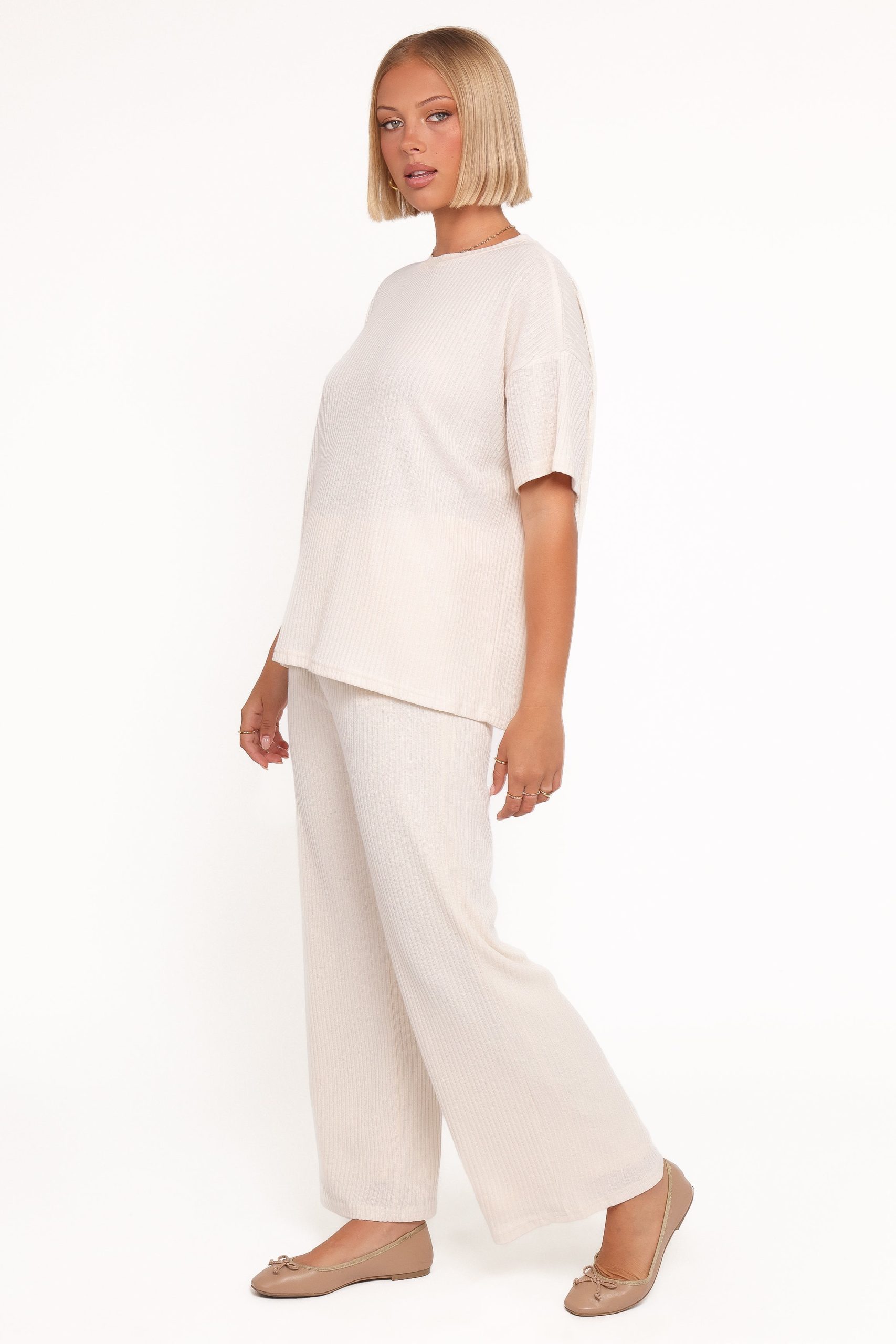 Meet the Granger Knit Pant Set. your new go-to for effortless style that works from morning coffee runs to late-night dinner dates. This perfectly coordinated two-piece features a relaxed top with a chic high round neckline and comfortable short sleeves that create a clean. modern silhouette.