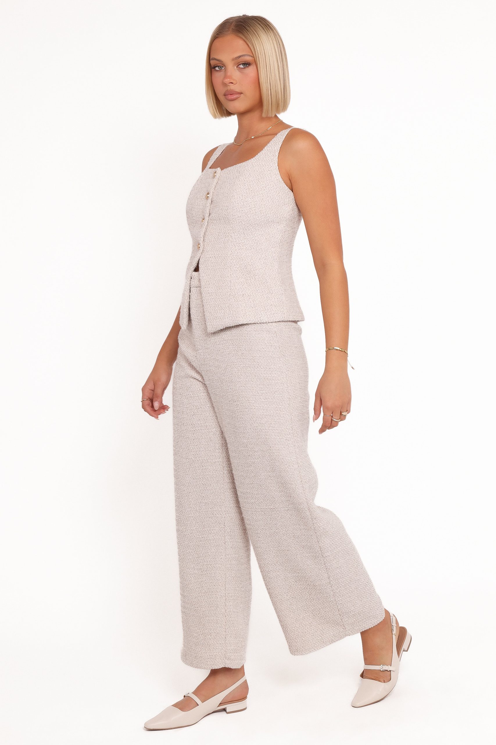Elevate your wardrobe with the Greta Tailored Pant Set – White Brown Marl . a sophisticated combination of timeless design and modern tailoring. Featuring a chic square neckline and wide adjustable straps. the top is both flattering and functional. finished with elegant buttons that run down the front for a refined touch.