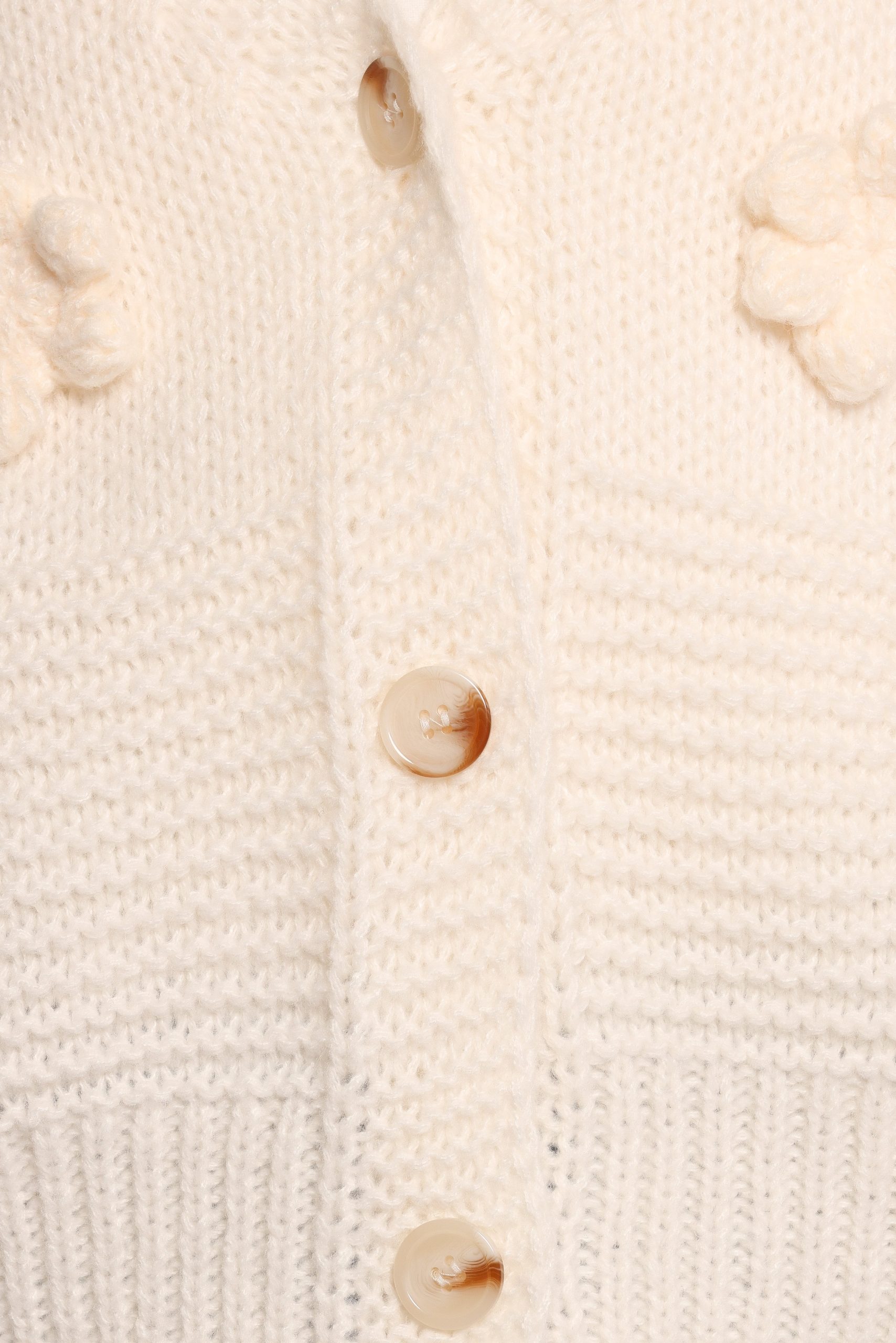 This cardigan boasts a timeless v-neckline and long balloon sleeves. finished with ribbed cuffs that gently hug the wrists. It’s the white color flower feature that truly sets this cardigan apart – each bloom artfully accentuated against the white background. creating a stunning visual bouquet that’s bound to turn heads.