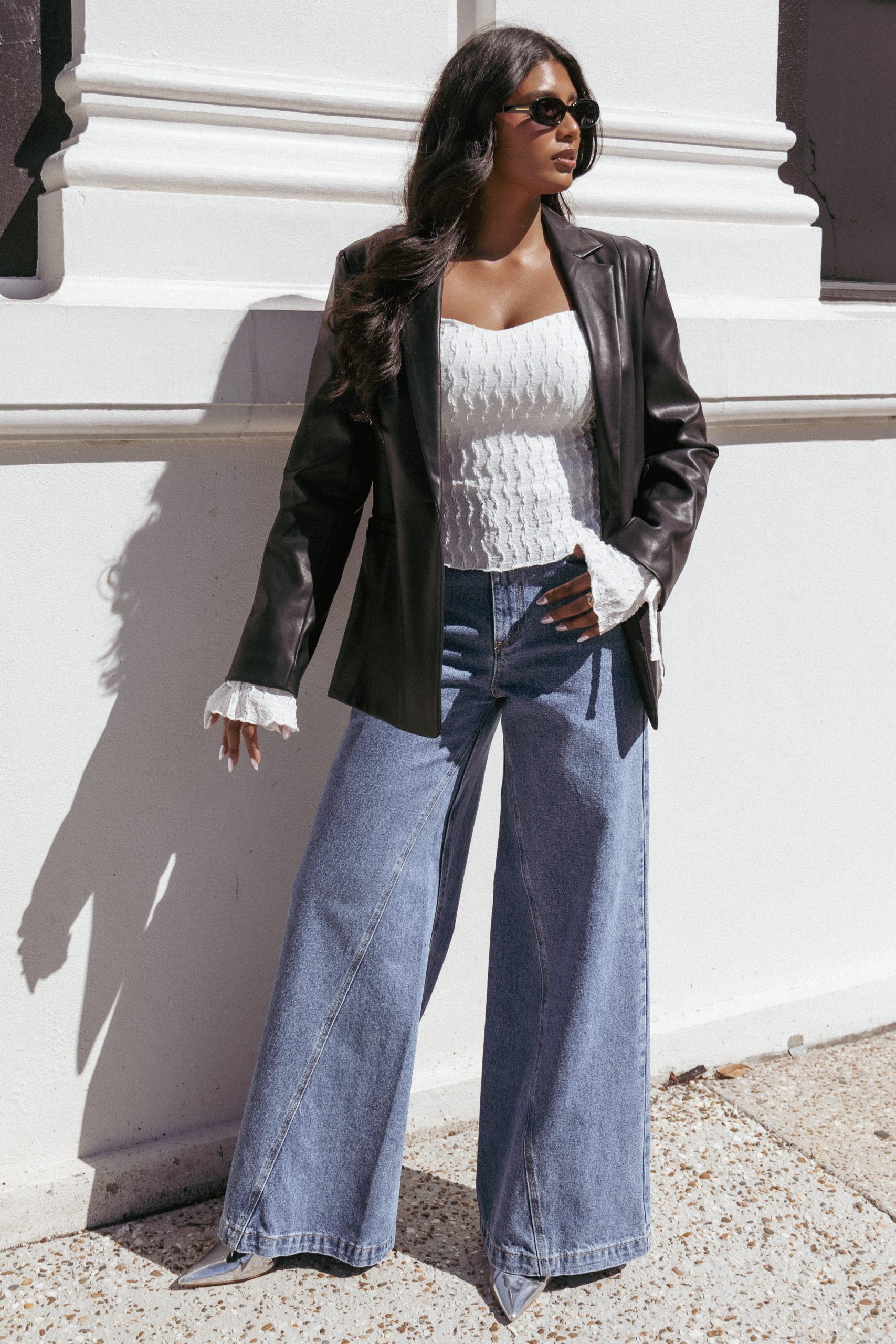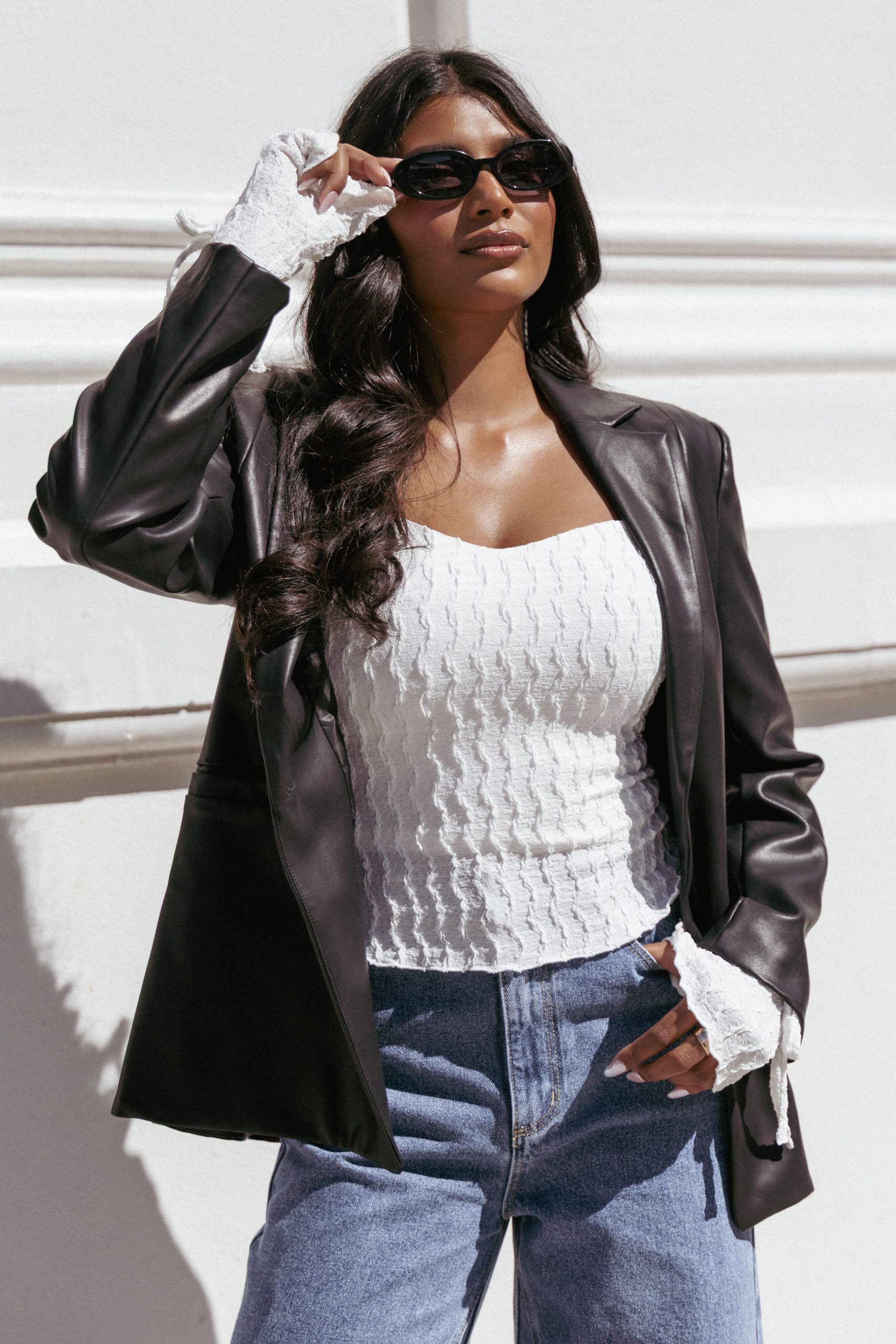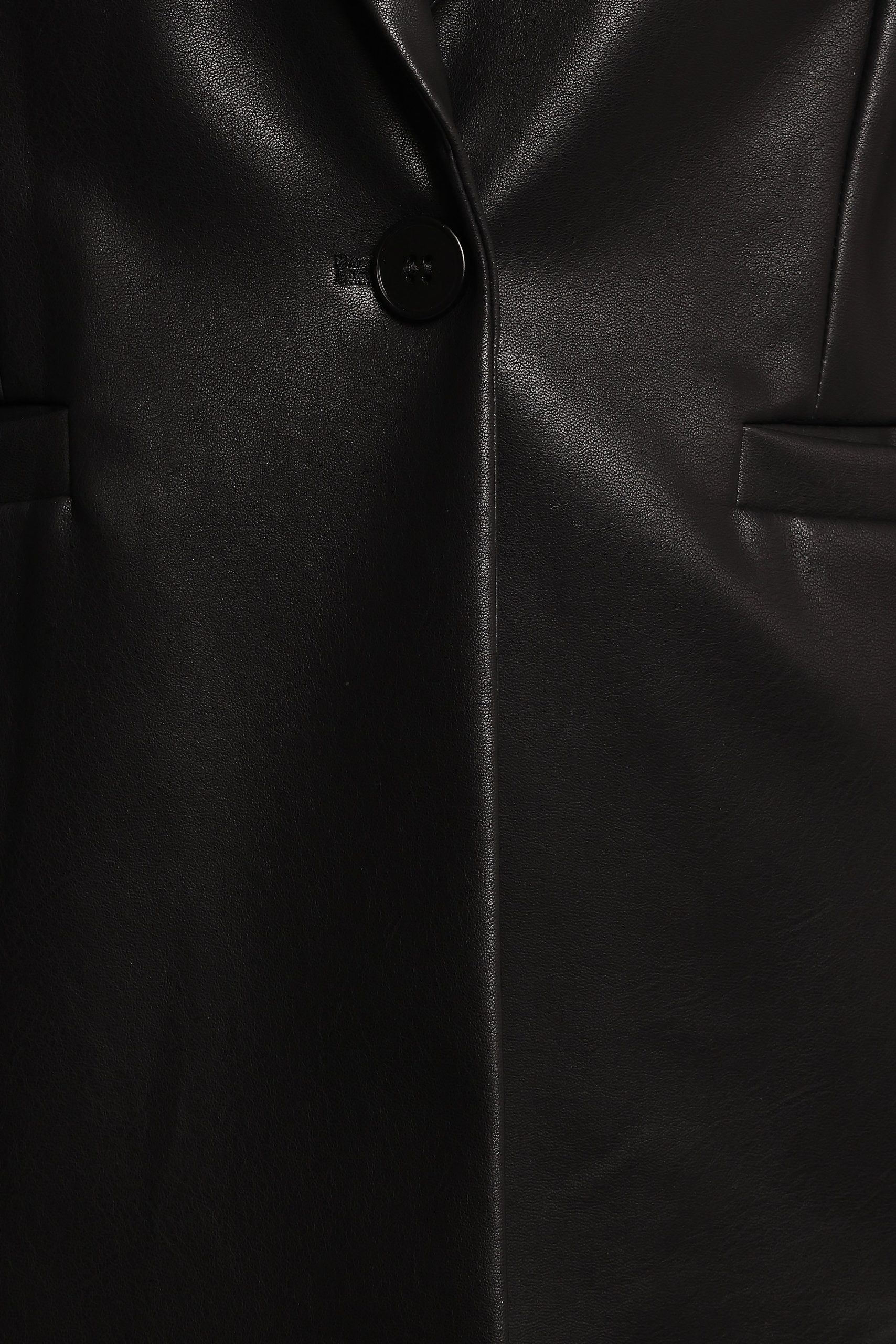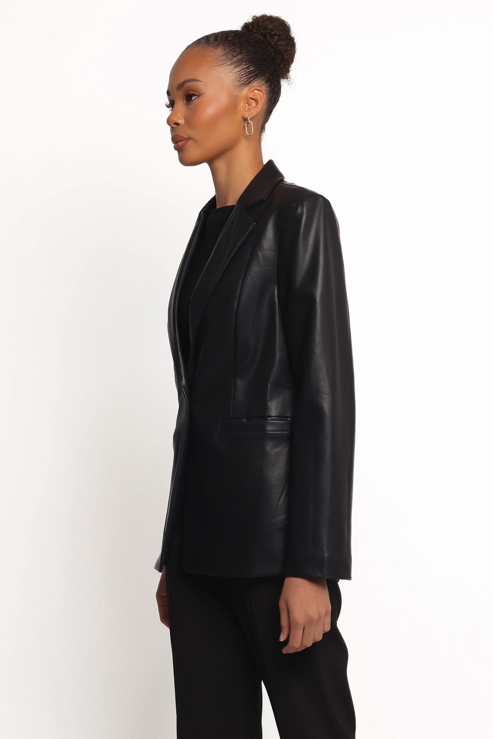 The Jamie Faux Leather Blazer in black is your ultimate statement piece for effortless sophistication. Featuring a sharp spread collar with elegant notch lapels and a sleek open front with a single button closure. it’s the perfect blend of modern edge and timeless tailoring.