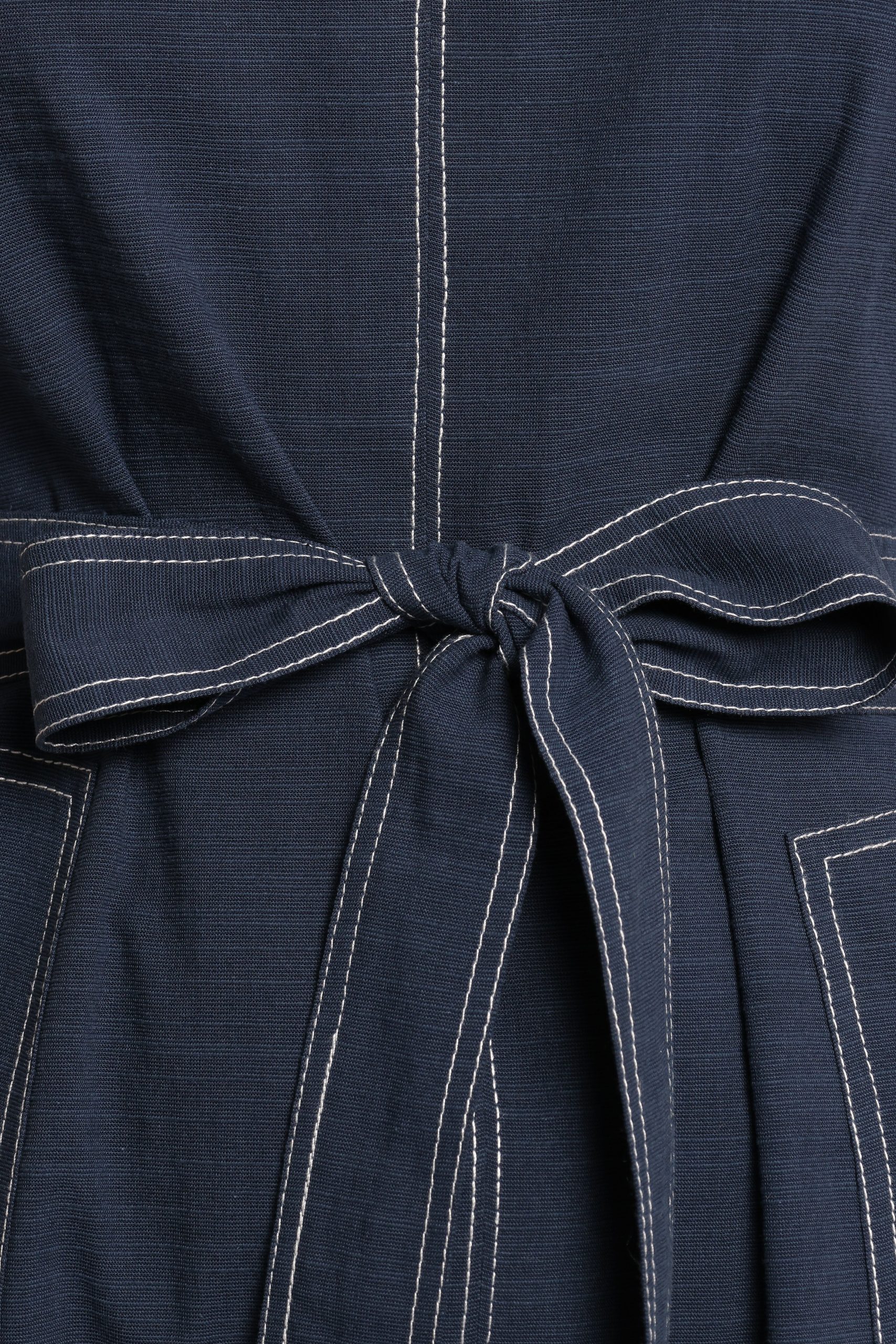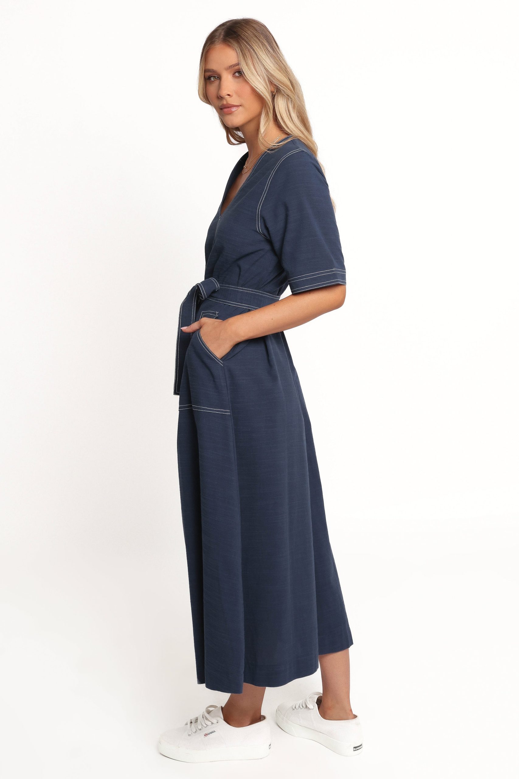 Featuring a flattering v-neckline and short sleeves. it strikes the perfect balance between comfortable and contemporary. The midi length and contrast stitch detail add a touch of modern sophistication. while the removable waist tie lets you customize the silhouette to suit your vibe.