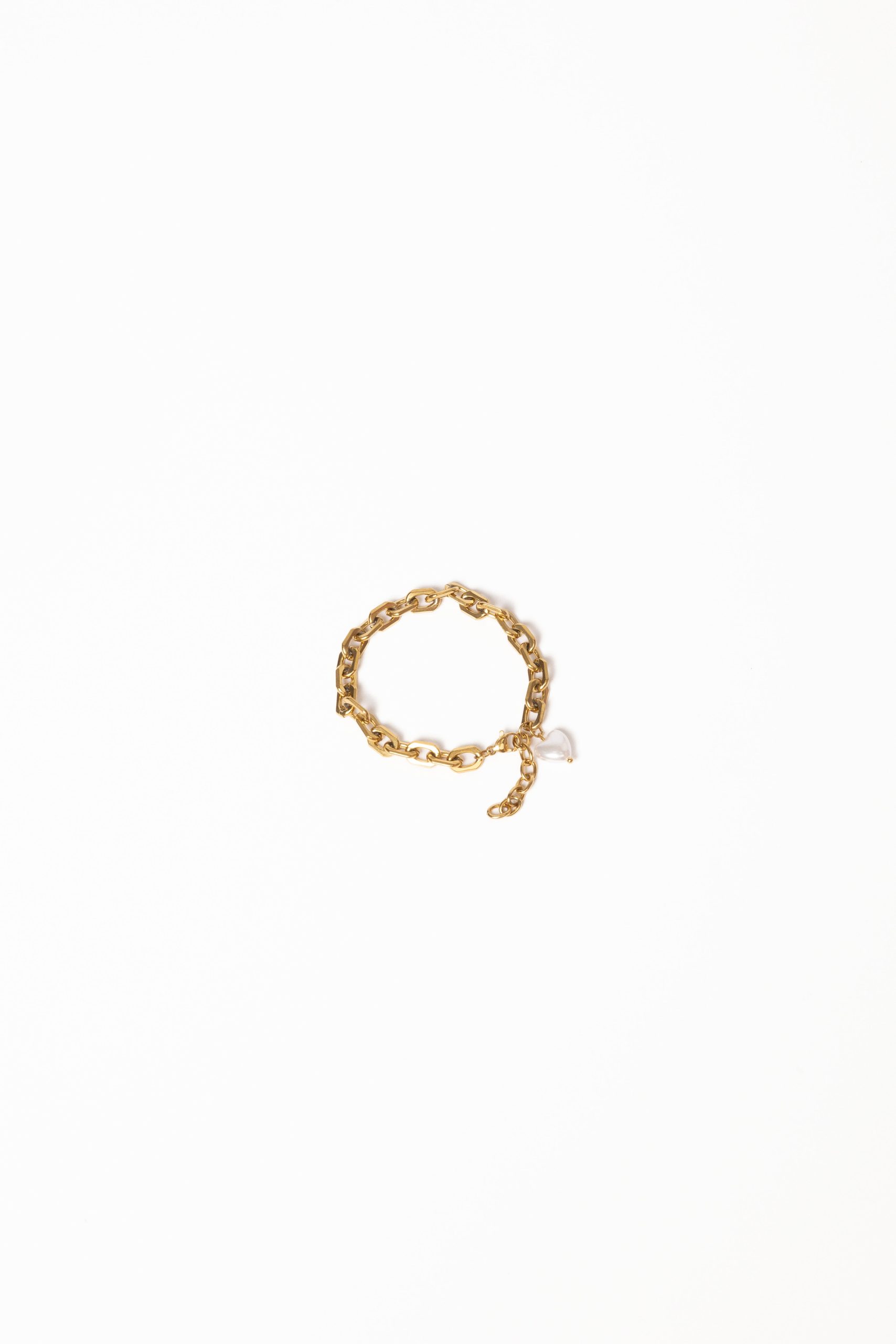 Add a touch of timeless elegance to your look with the Kaelani Bracelet in Gold Pearl. Featuring a chic gold link chain paired with a dainty faux pearl heart charm. this bracelet is the perfect blend of classic and modern design.