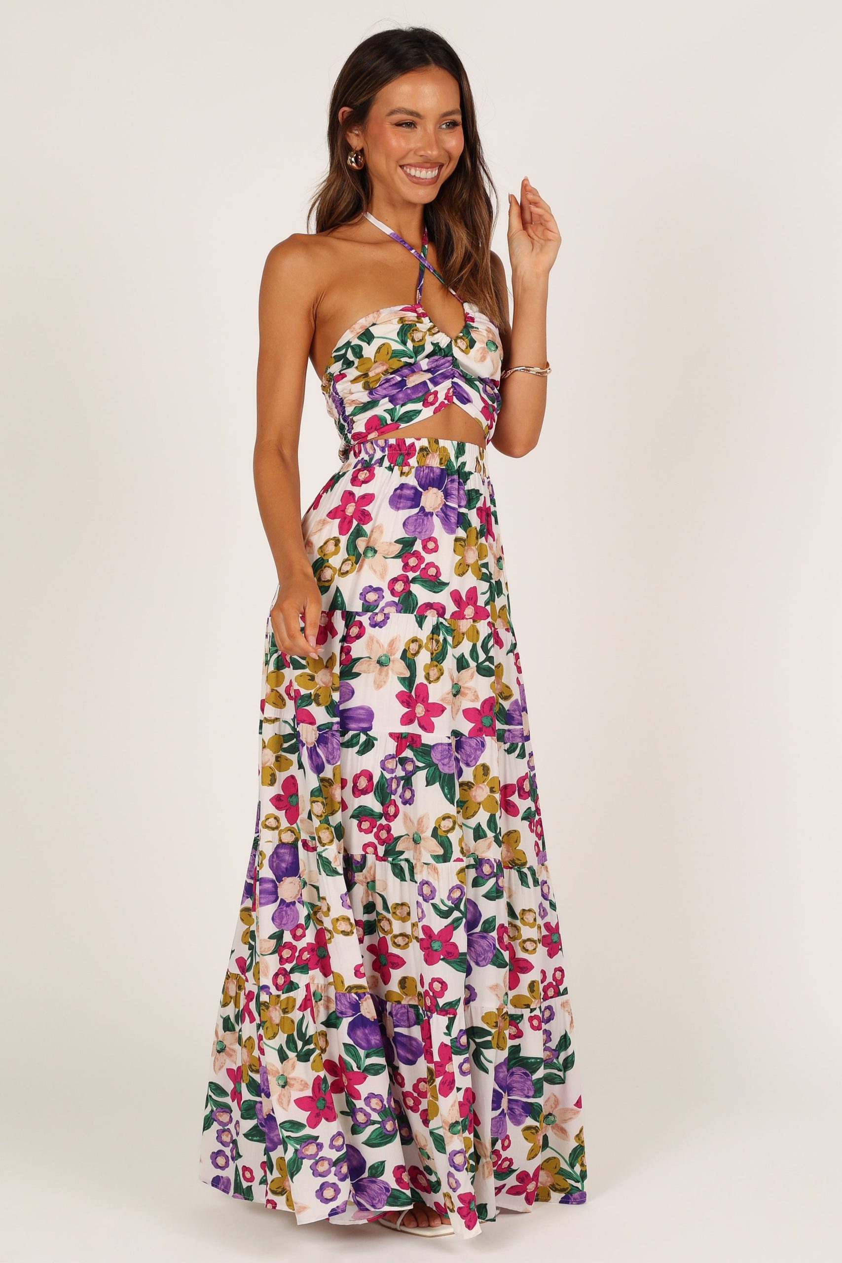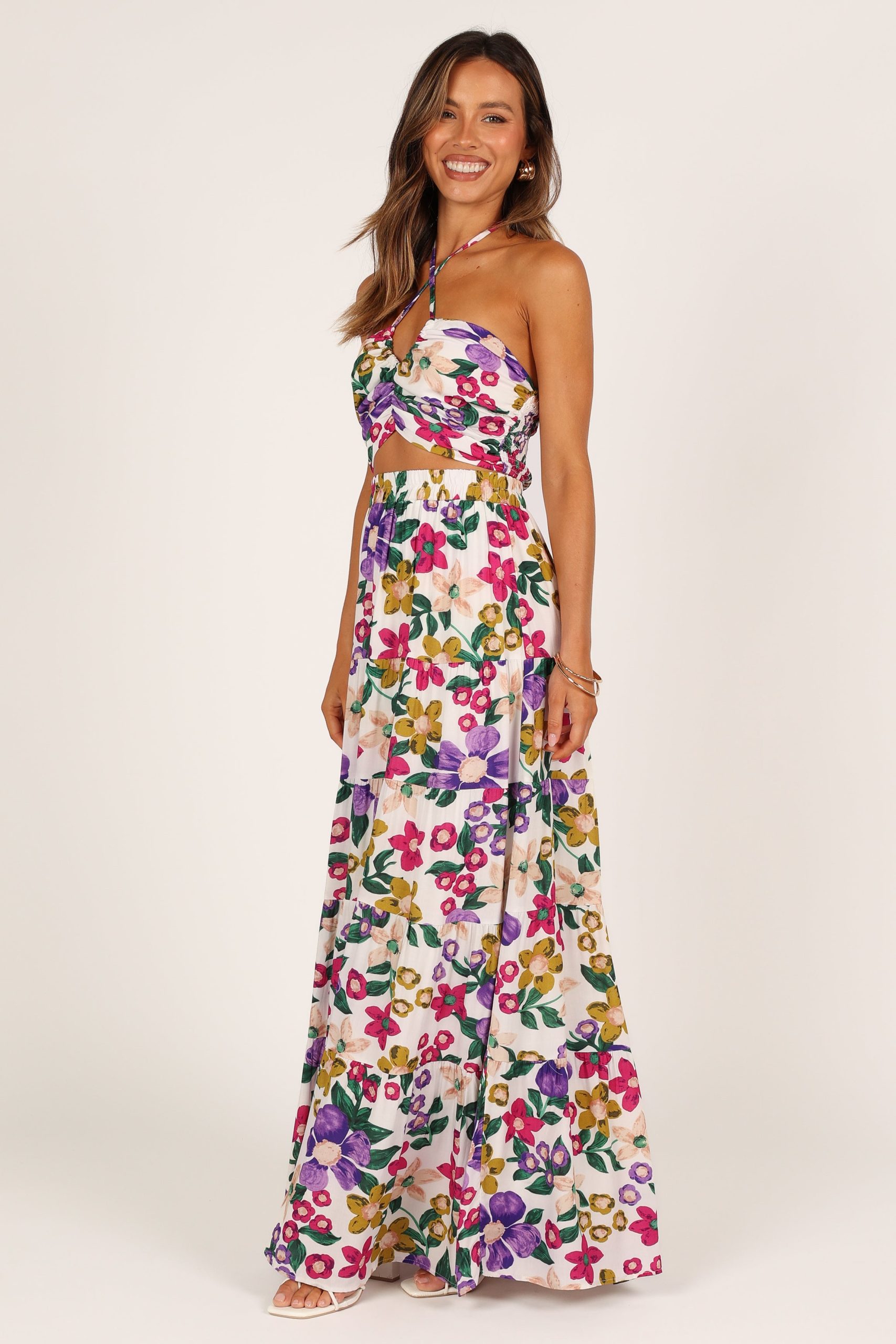 This matching crop top and maxi skirt set is the perfect summer look! The halterneck top has a tie close for a touch of glamour. as well as shirred back panel with gathered detail on the bust. The matching high waisted maxi skirt features an elasticised waistband and A-line silhouette. finished off with a beautiful floral print design.