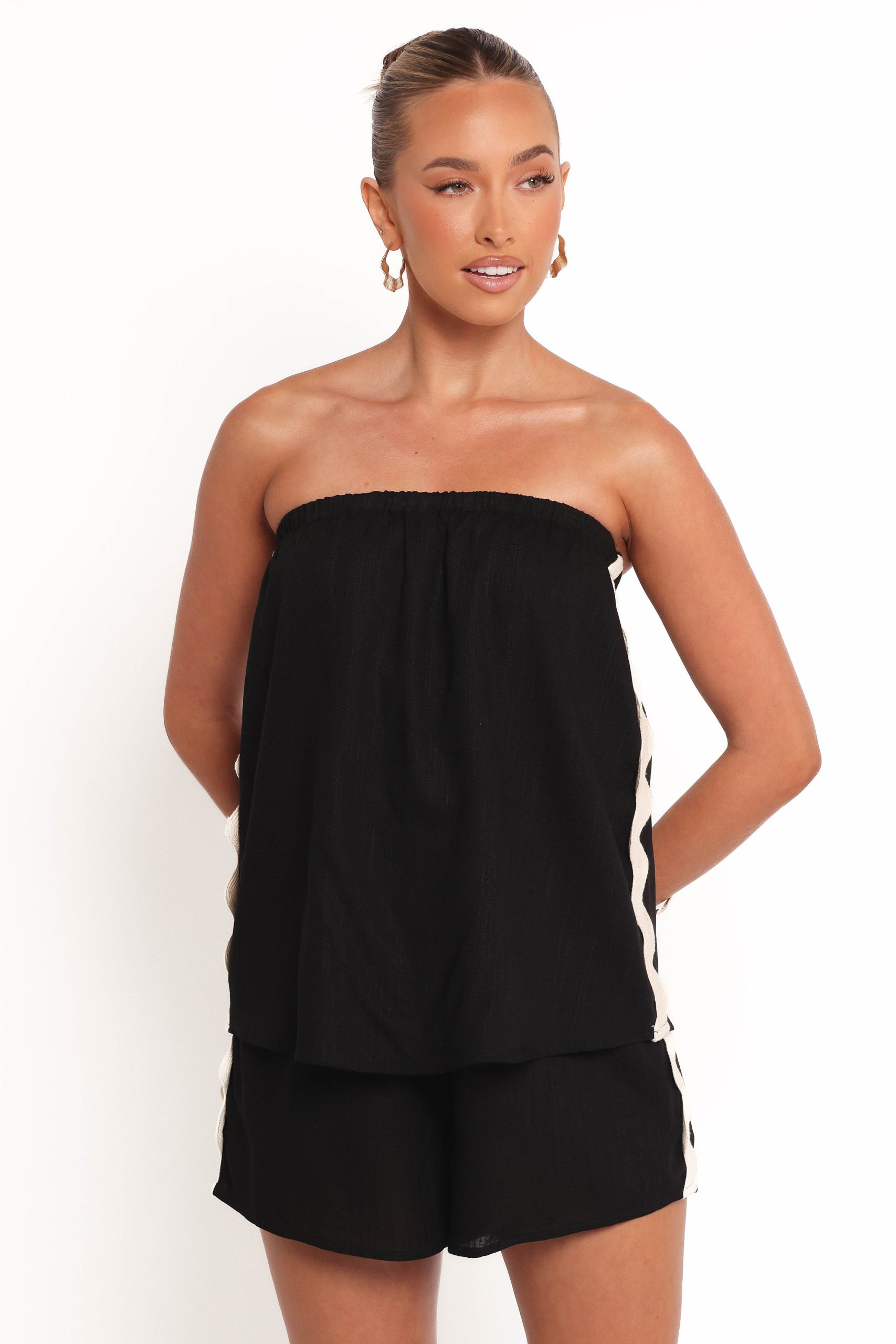 Turn up the heat this summer with the Kristia Strapless Romper in Black. Designed with a carefree elasticised neckline and waistband. this strapless romper offers an effortlessly chic silhouette that’s all about comfort and ease.