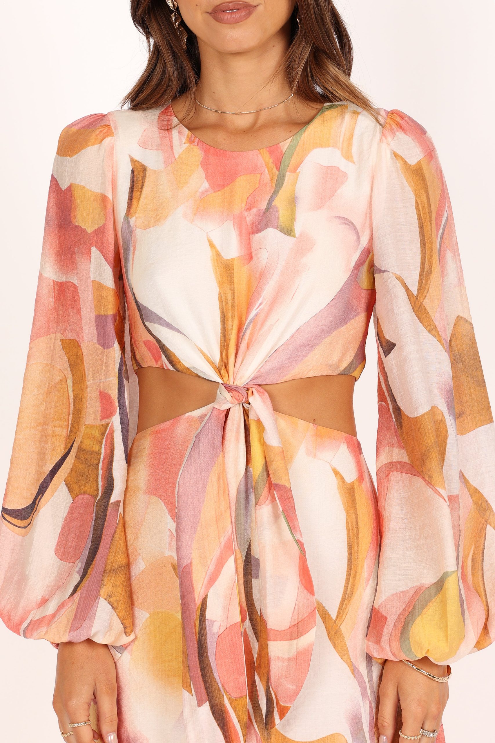 Are you looking for the perfect maxi dress for an upcoming wedding? Look no further! Our maxi length dress with a round neckline. long sleeves with elasticised cuffs and a front tie close feature is sure to turn heads. Due to the nature of this print design. each garment is unique and print placement may differ slightly from product imagery