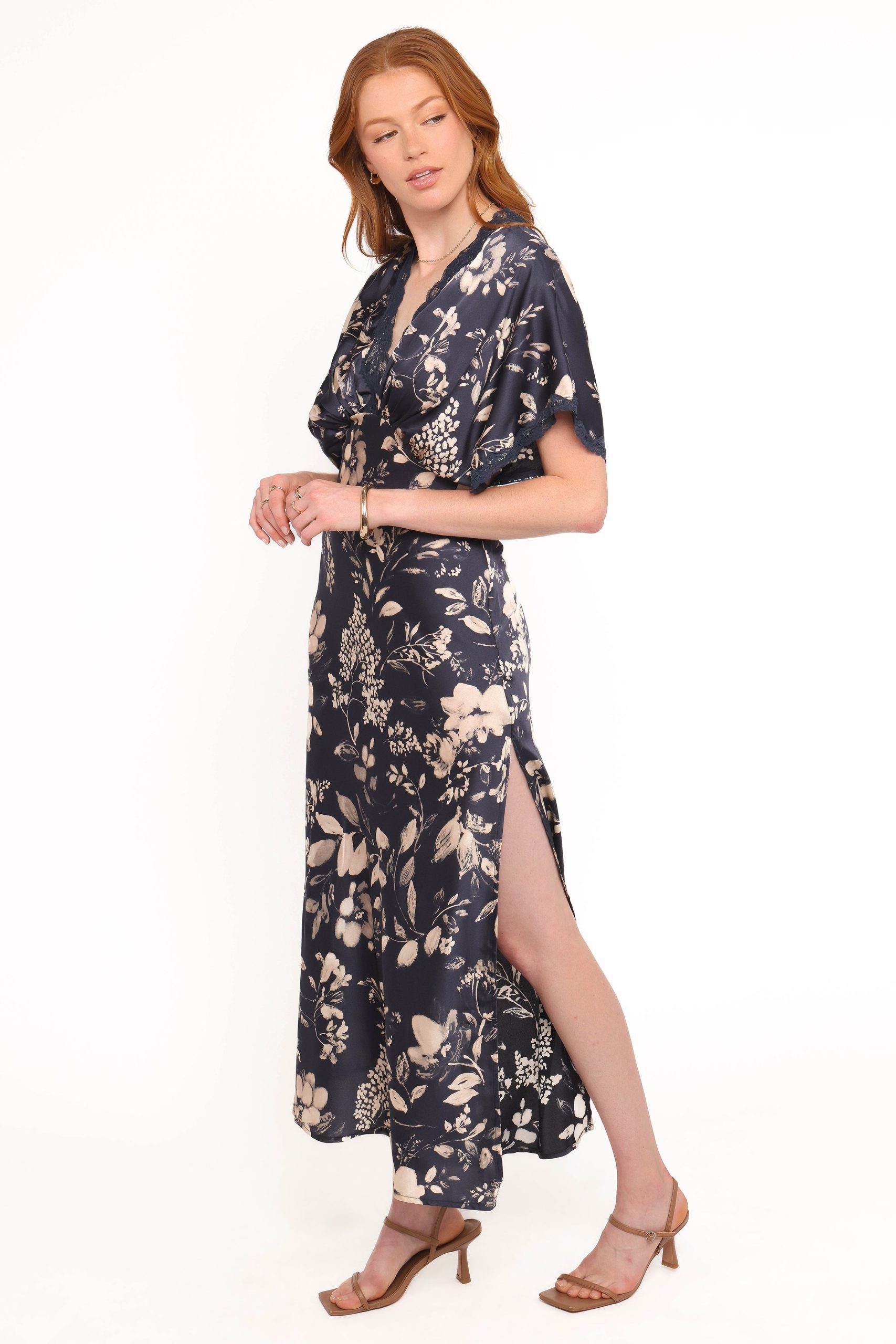 Step into effortless elegance with the Laurent Midi Dress in Navy Cream Floral. This dreamy piece features a universally flattering v-neckline that elongates your silhouette. while the midi length strikes the perfect balance between sophisticated and playful.