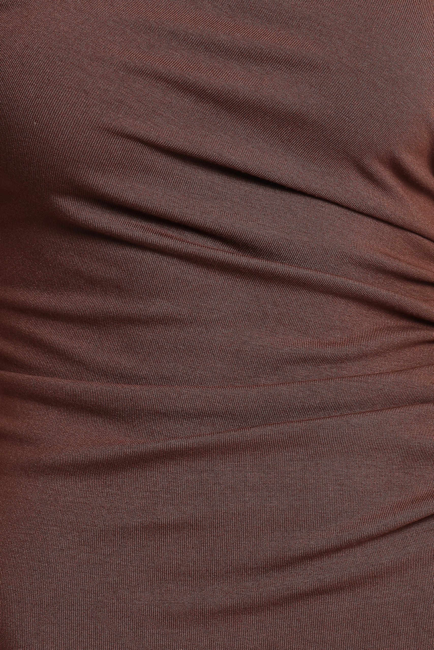 Turn heads effortlessly with the Lioren Midi Dress in rich. chocolate brown. This sleek. midi-length silhouette is designed with a high neckline and short sleeves for an elegant. understated look. while the ruched gathered detail adds a touch of texture and modern style.