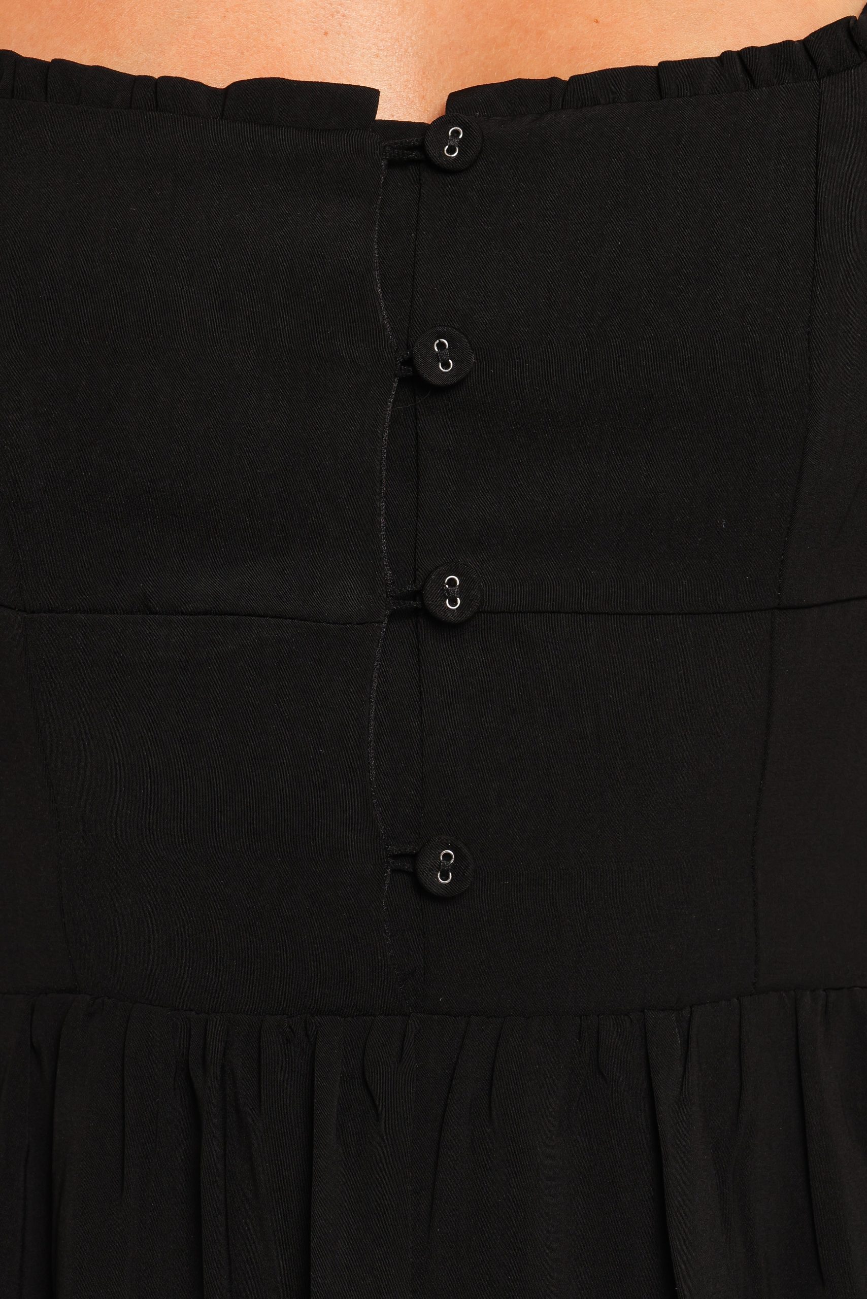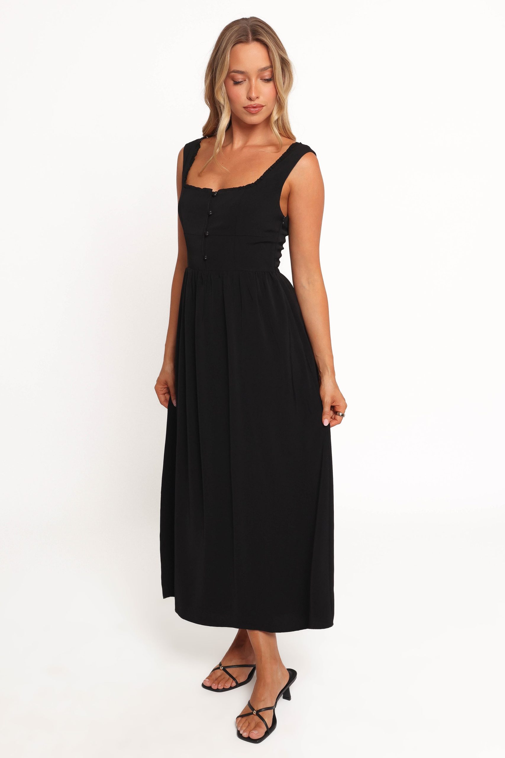 Effortlessly chic meets everyday elegance with the Melrose Midi Dress in black. Designed with a flattering square neckline and a functional button-down bust. this piece combines timeless detail with modern practicality.