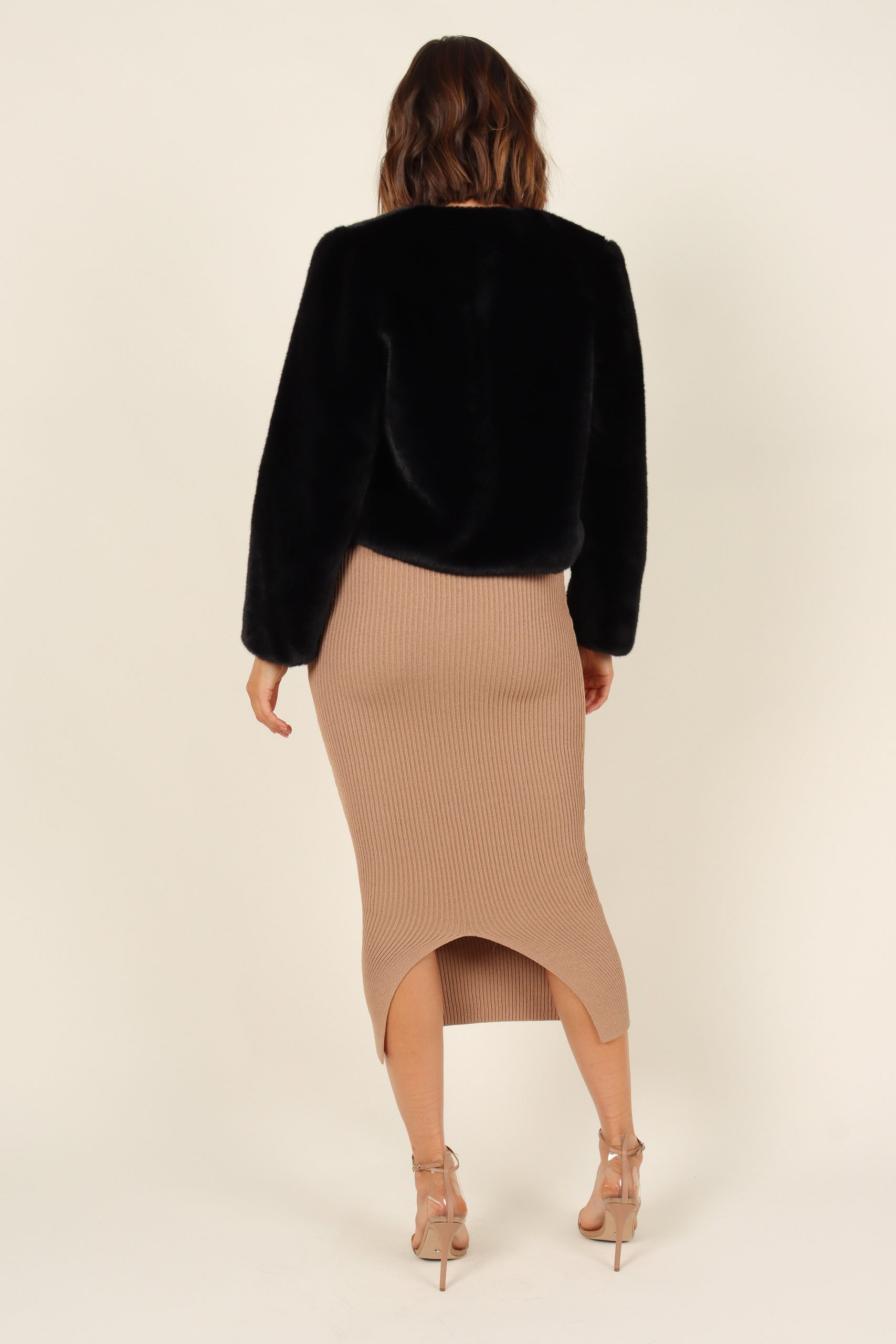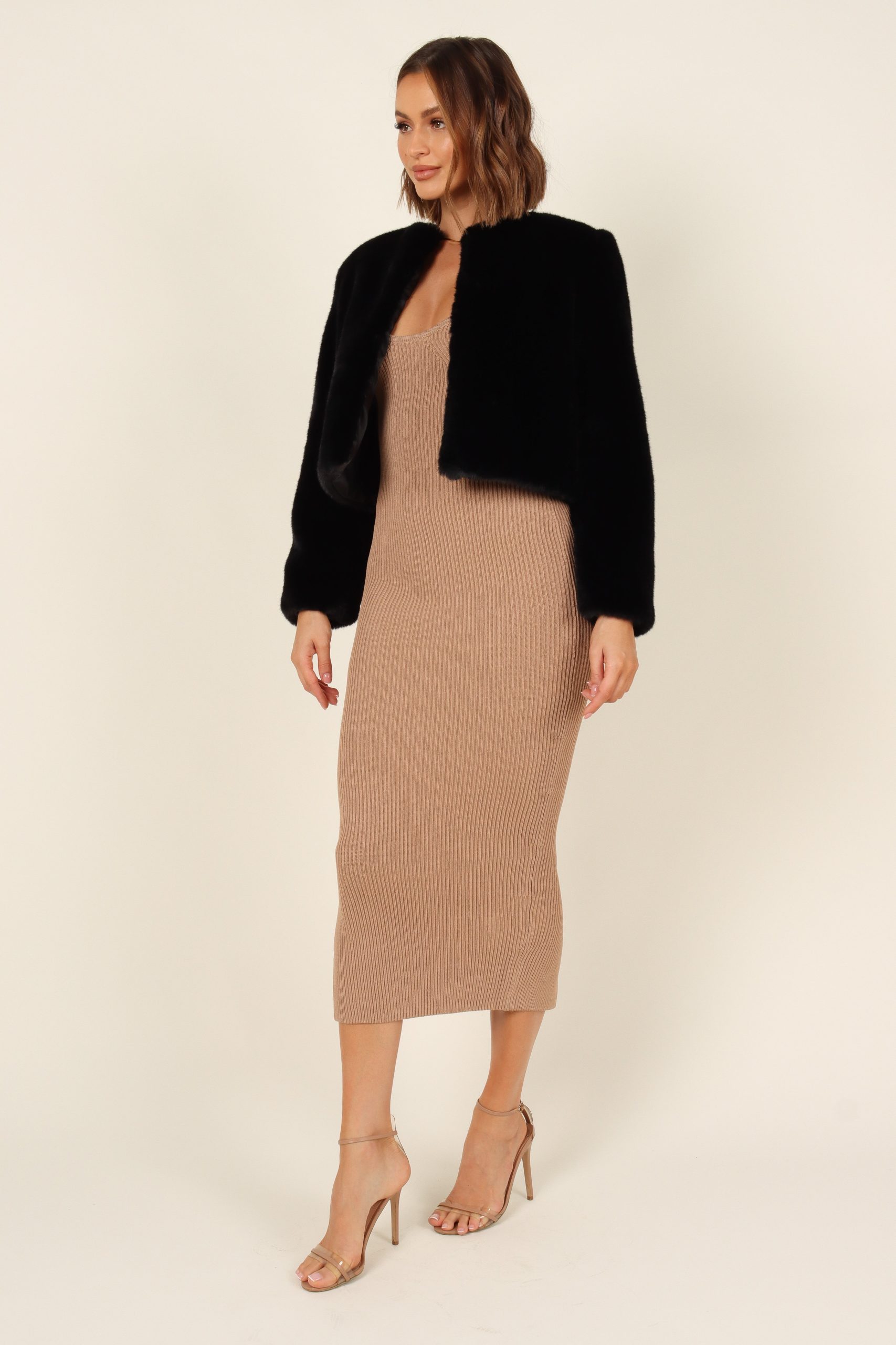 This gorgeous jacket is the perfect way to stay stylish and warm no matter what the temperature. It features a cropped length. hook and eye close on front. long sleeves. functional side pockets and faux fur soft feel that will keep you feeling cosy all season long.