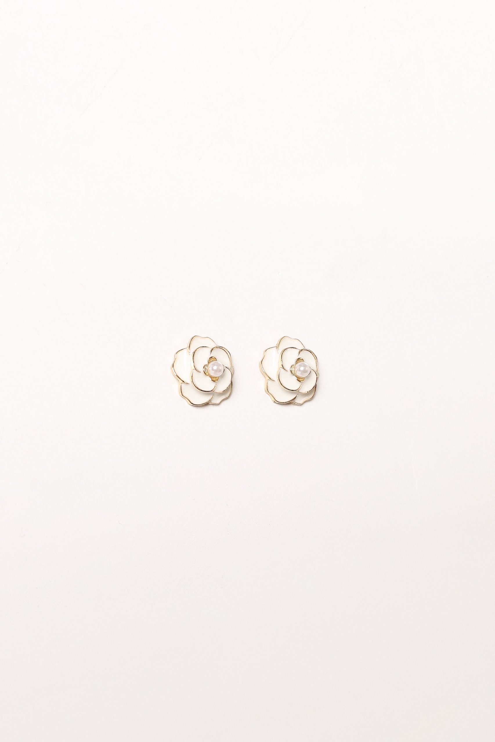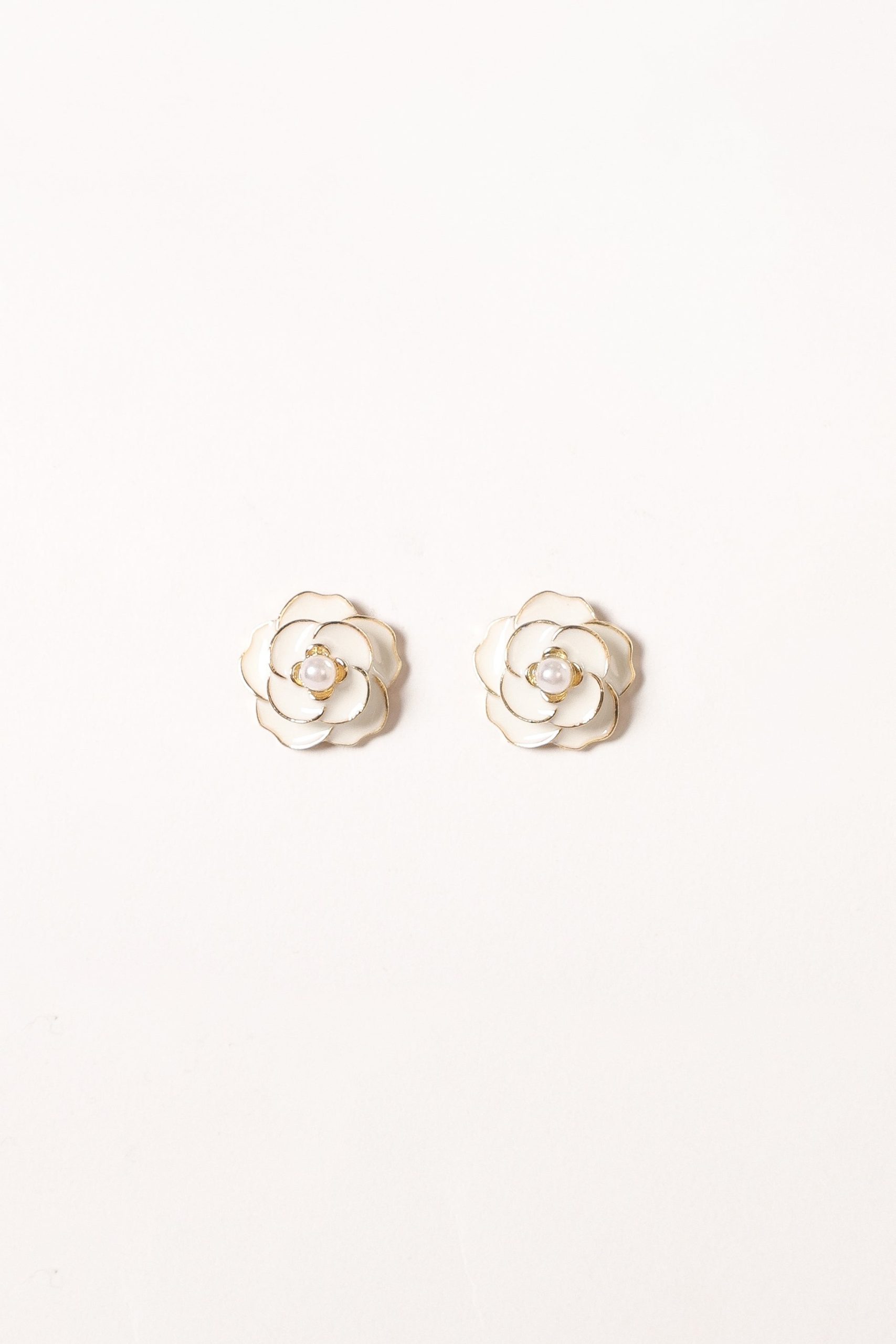 These stud-style earrings are the epitome of sophistication. boasting a delicate enamel flower feature. Each blossom is carefully detailed with faux pearl and gold accents. creating a stunning contrast against the white enamel.