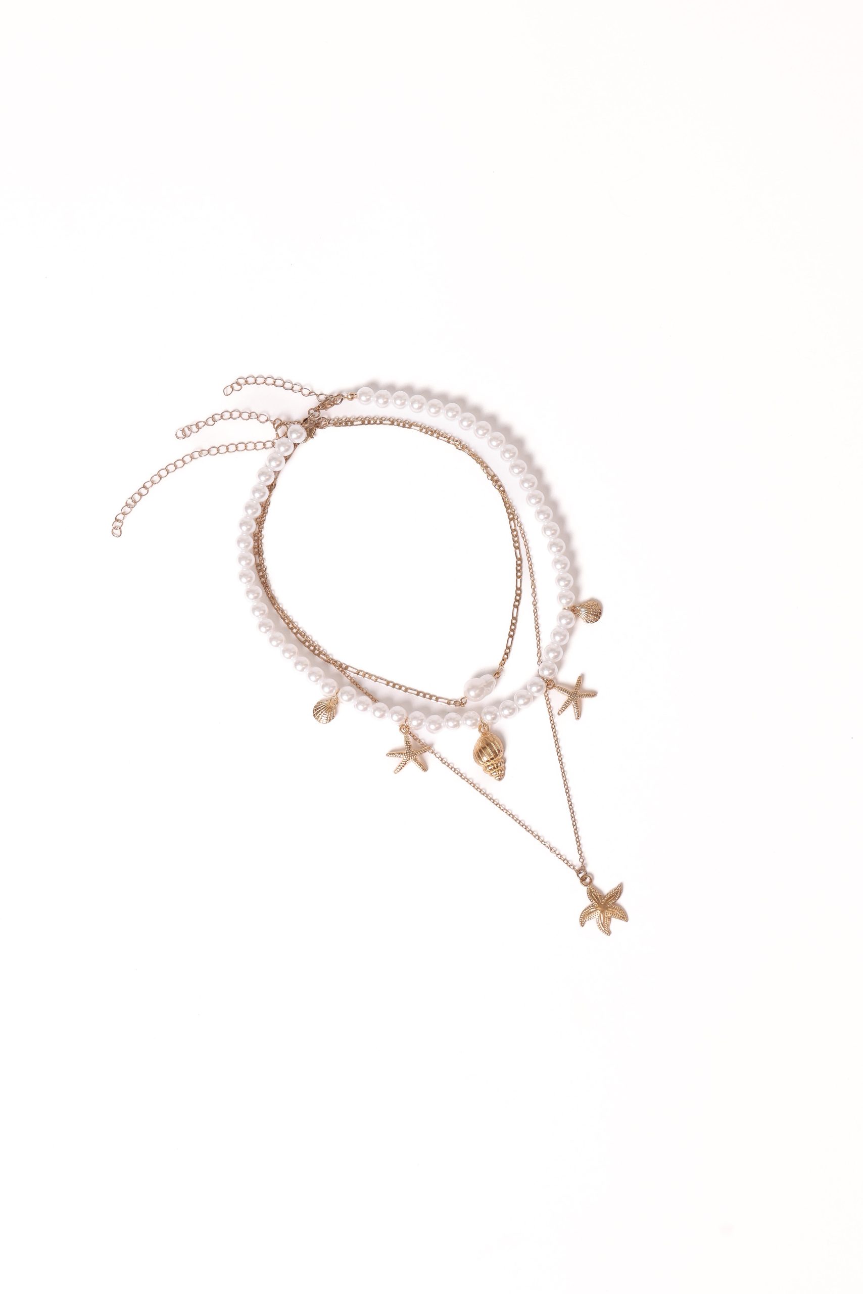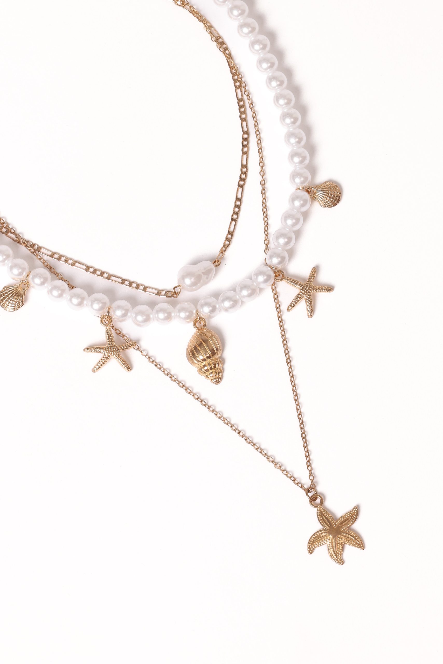 Elevate your everyday look with the Riviera Necklace in Gold/Pearl. a chic set of three layered designs that bring effortless fun to any outfit.