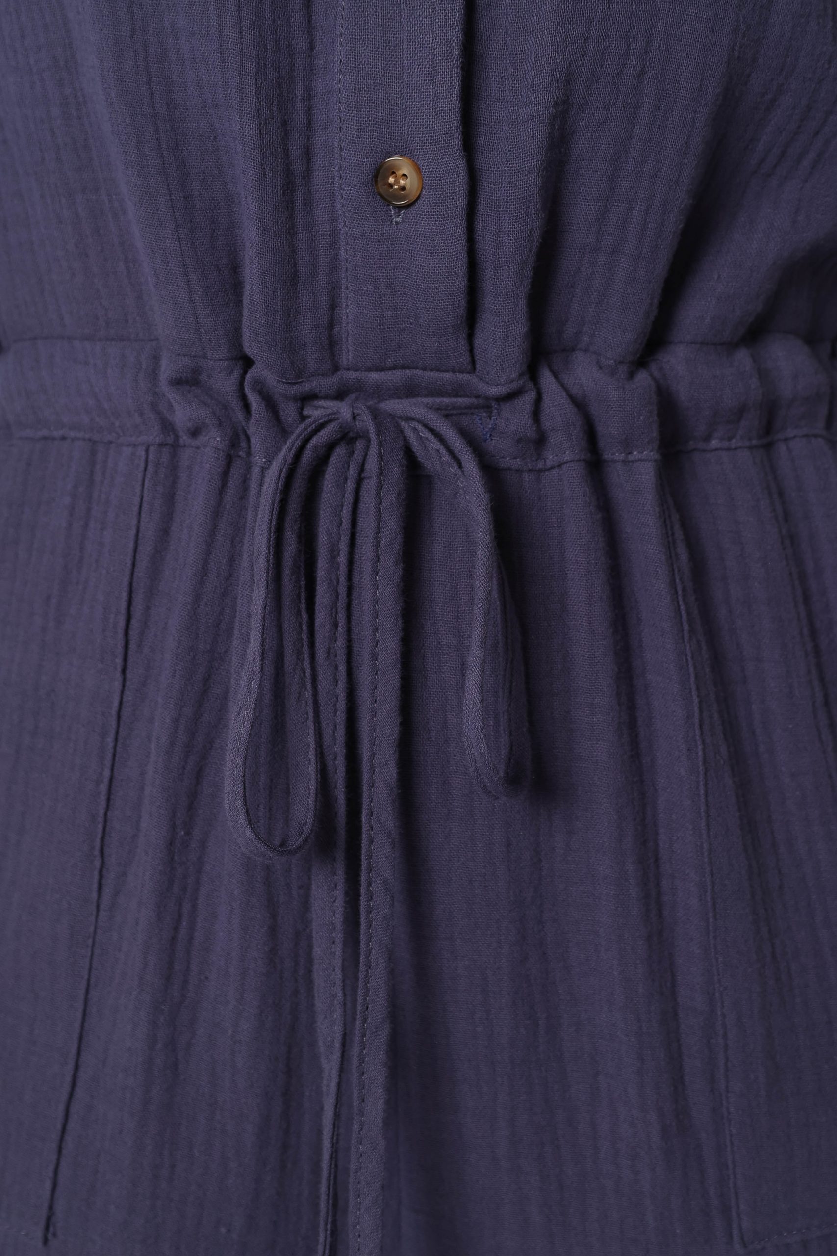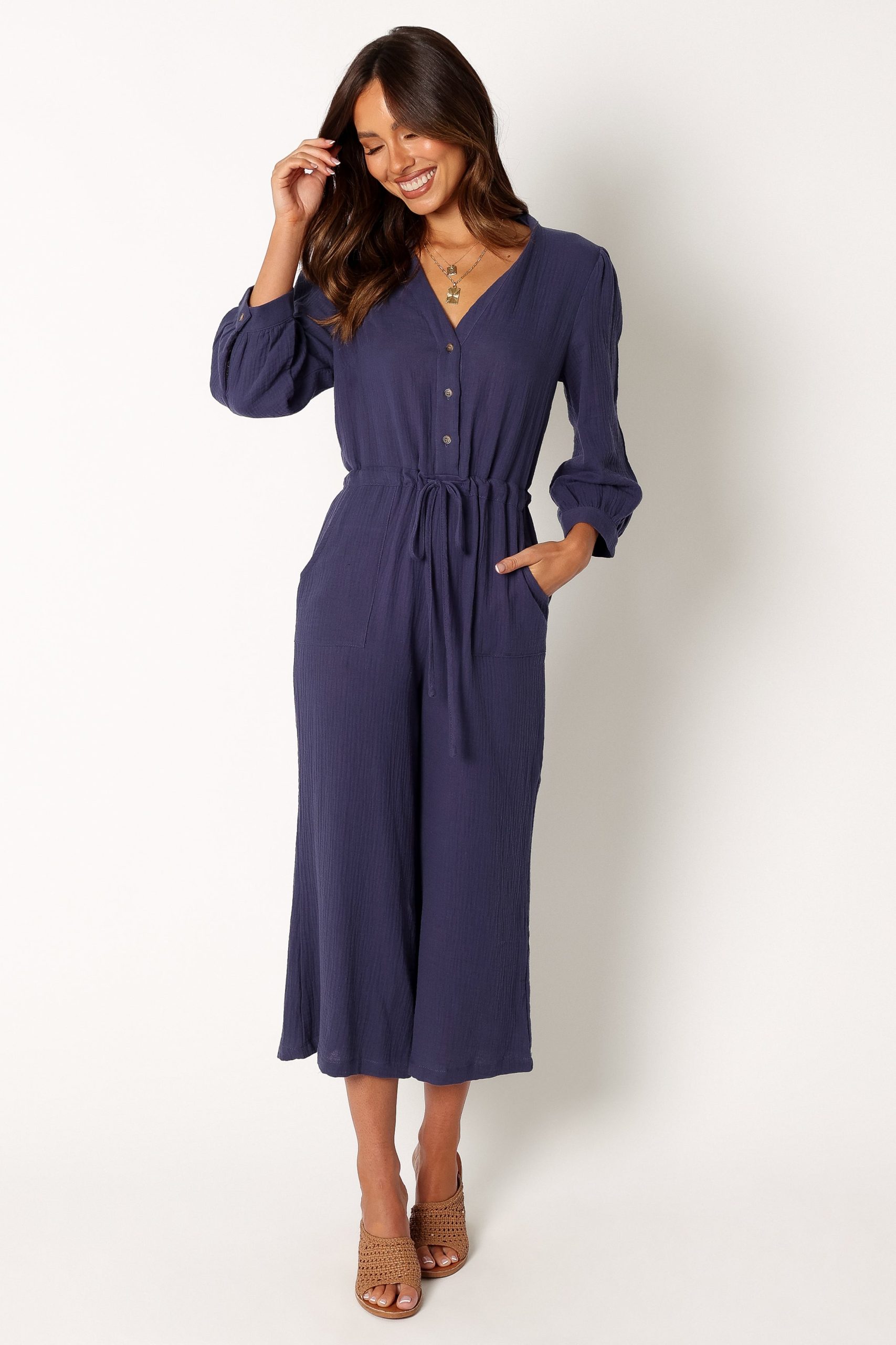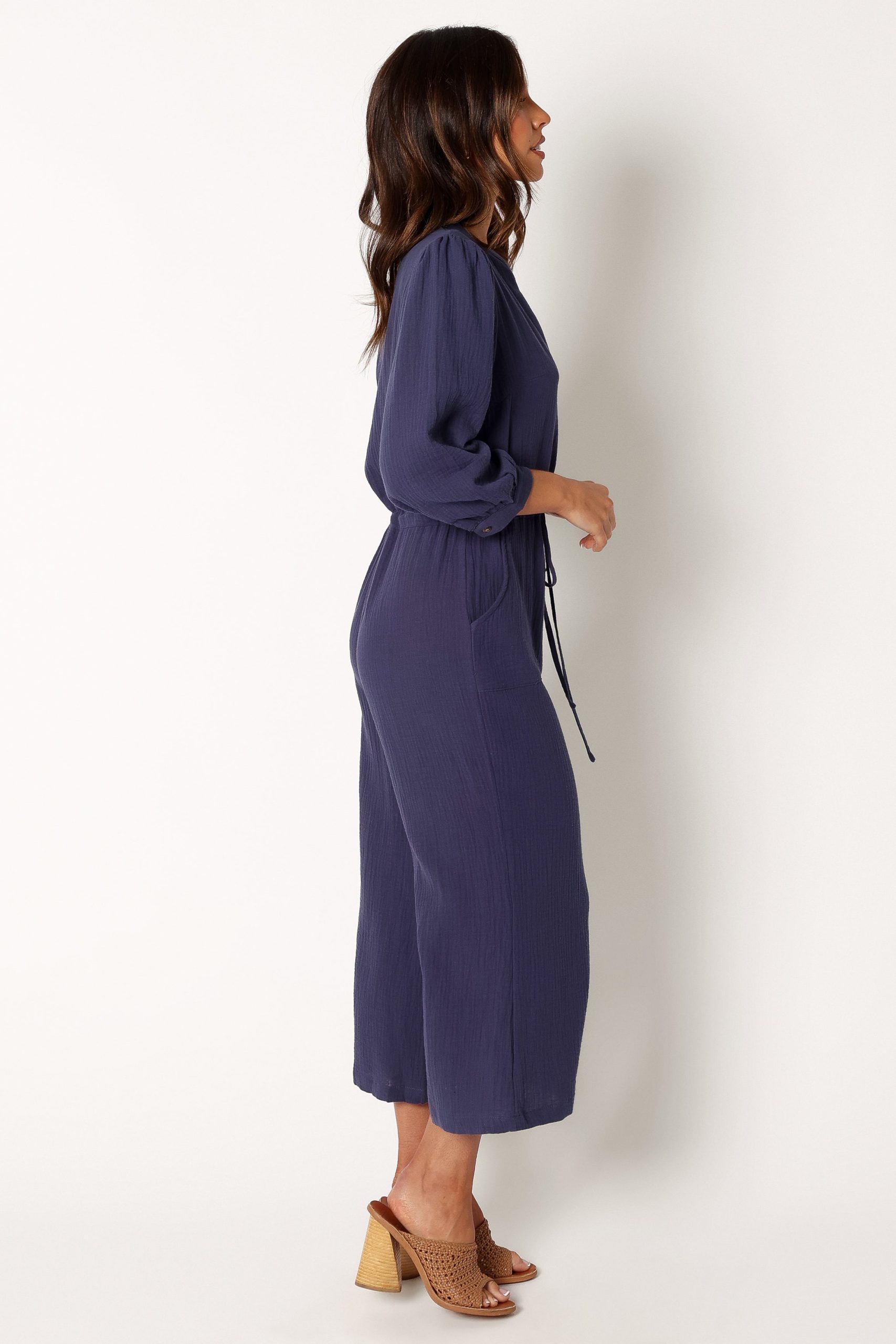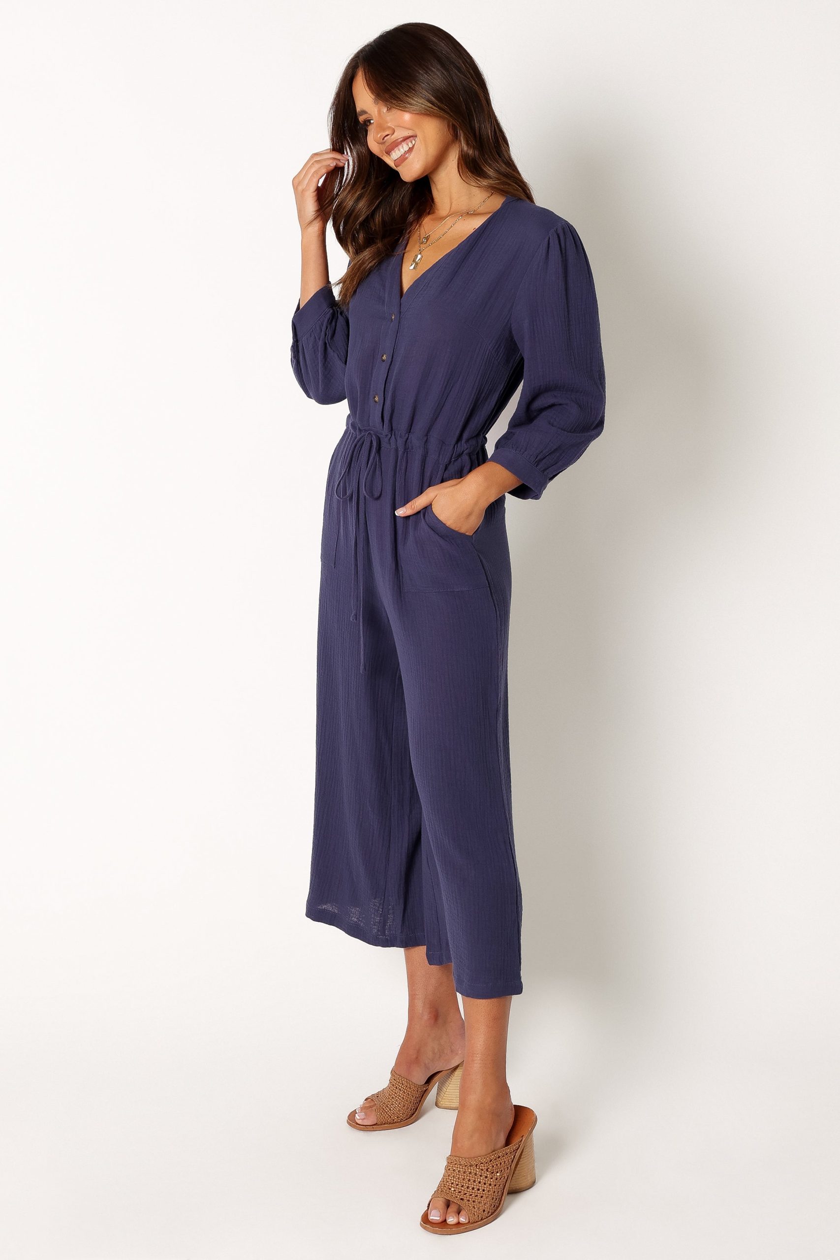 Featuring a v neckline and mid-length sleeves. the Roberta Jumpsuit gives off a relaxed yet stylish vibe. The front functional button down and side functional pockets provide convenience and functionality. while the front drawstring tie and the wide cropped style leg add a playful touch.