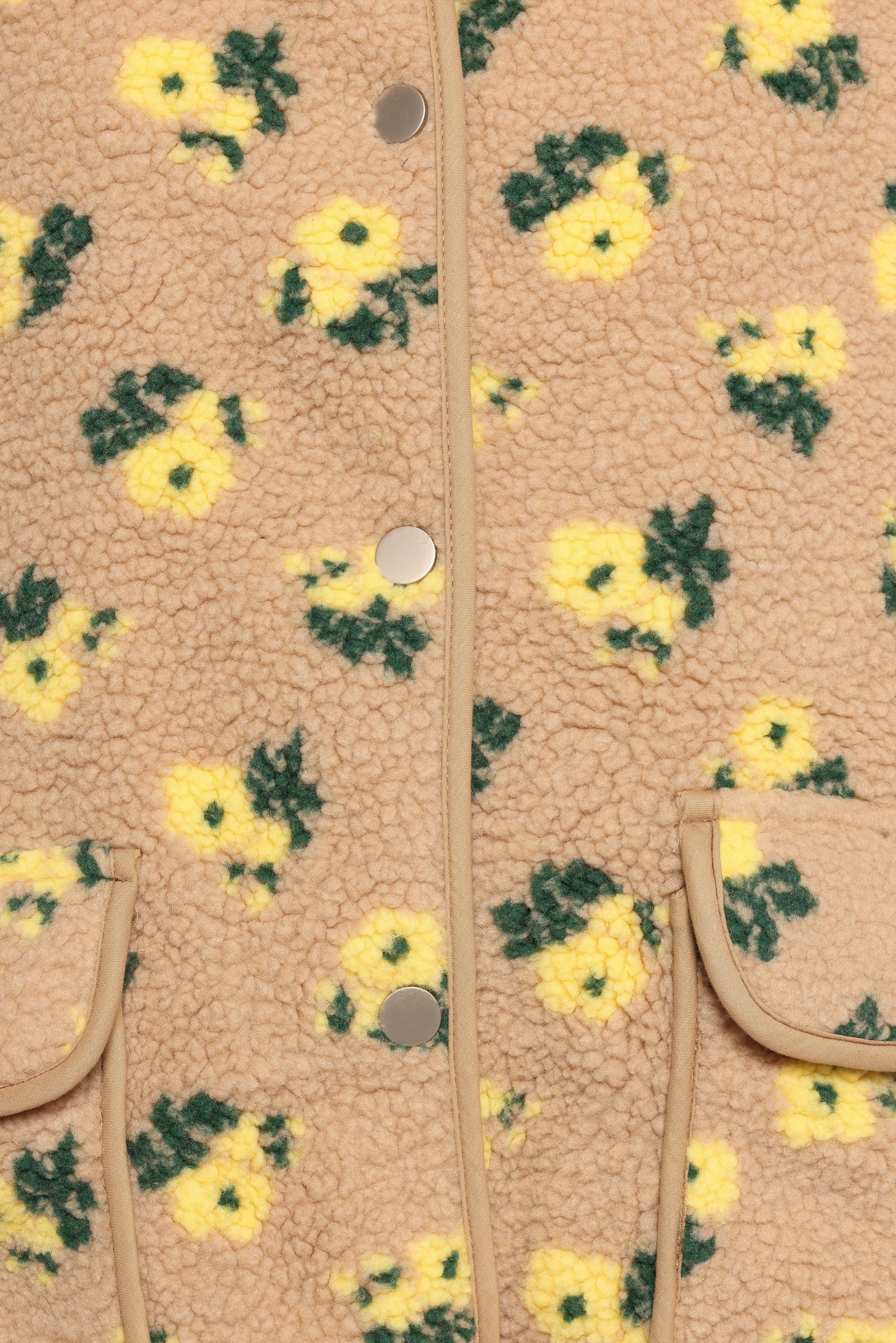 This jacket is crafted from plush teddy material that feels like a warm hug on chilly days. effortlessly blending comfort with fashion. Adorned with a delicate yellow floral print. it brings a touch of sunshine to your wardrobe. perfect for those looking to make a statement.